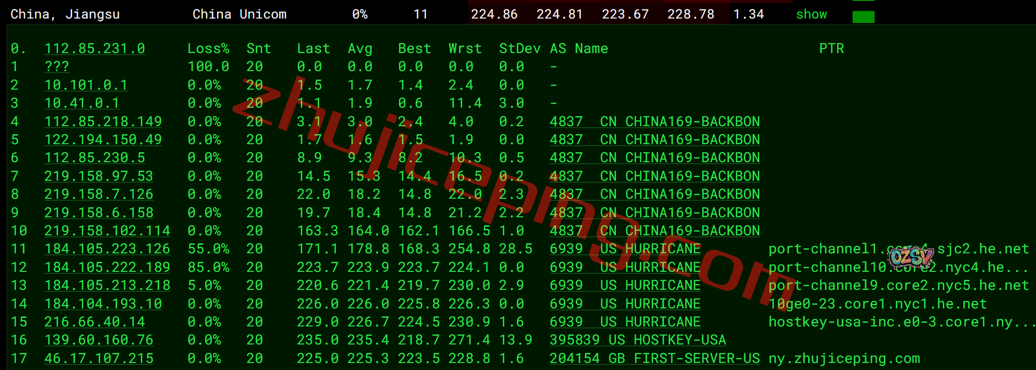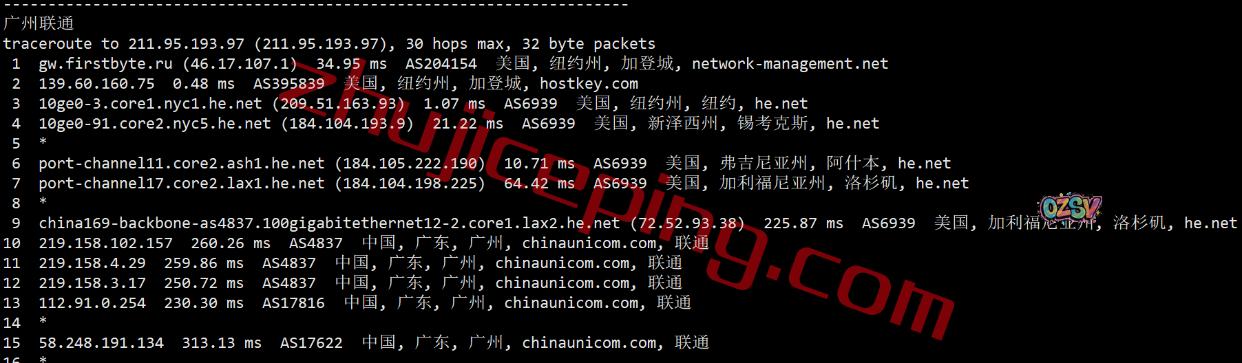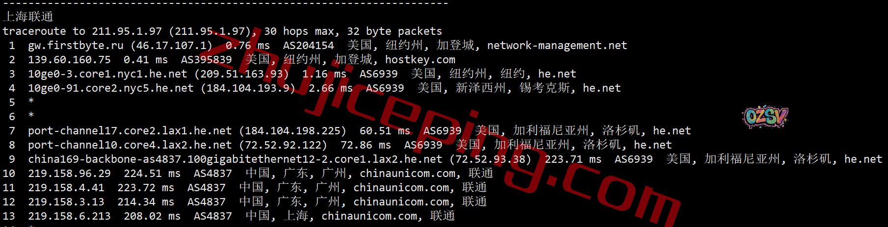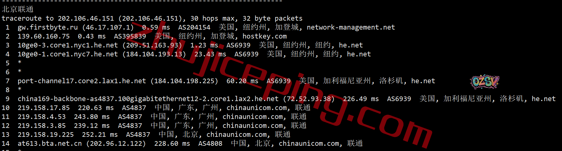 联通去程:直连联通圣何塞节点,然后走HE过去纽约