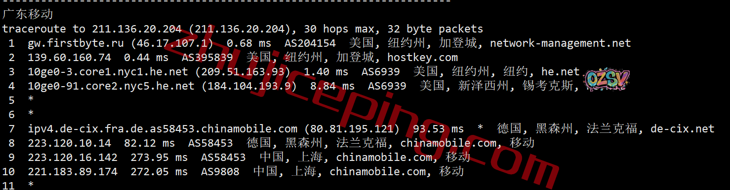 广州方向:走HE到德国法兰克福的de-cix数据交换中心,接移动在法兰克福的节点,直连回国