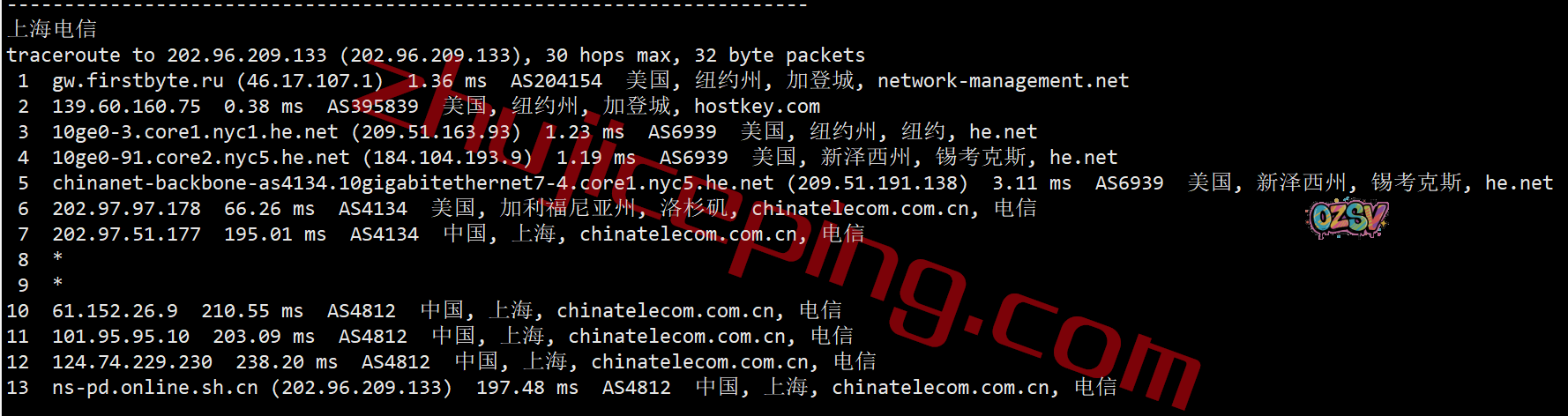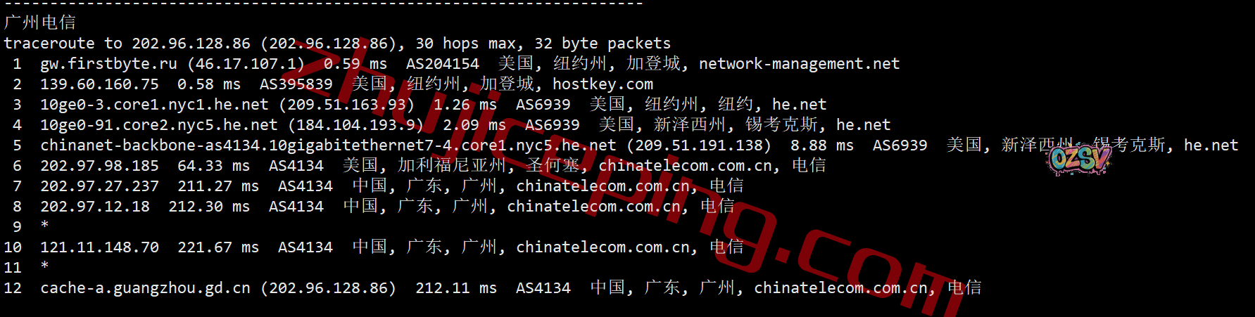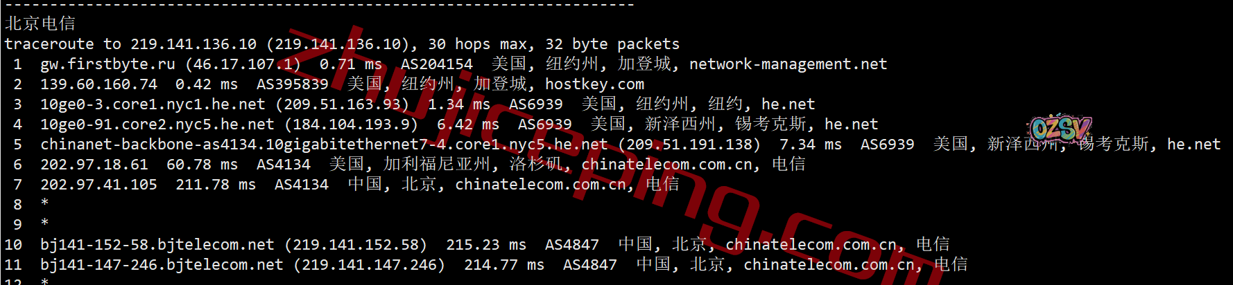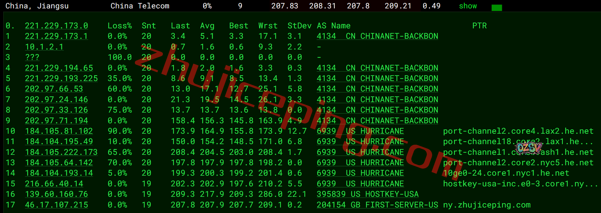 电信去程:直连电信洛杉矶节点后转HE.NET从去阿什本、纽约到机房