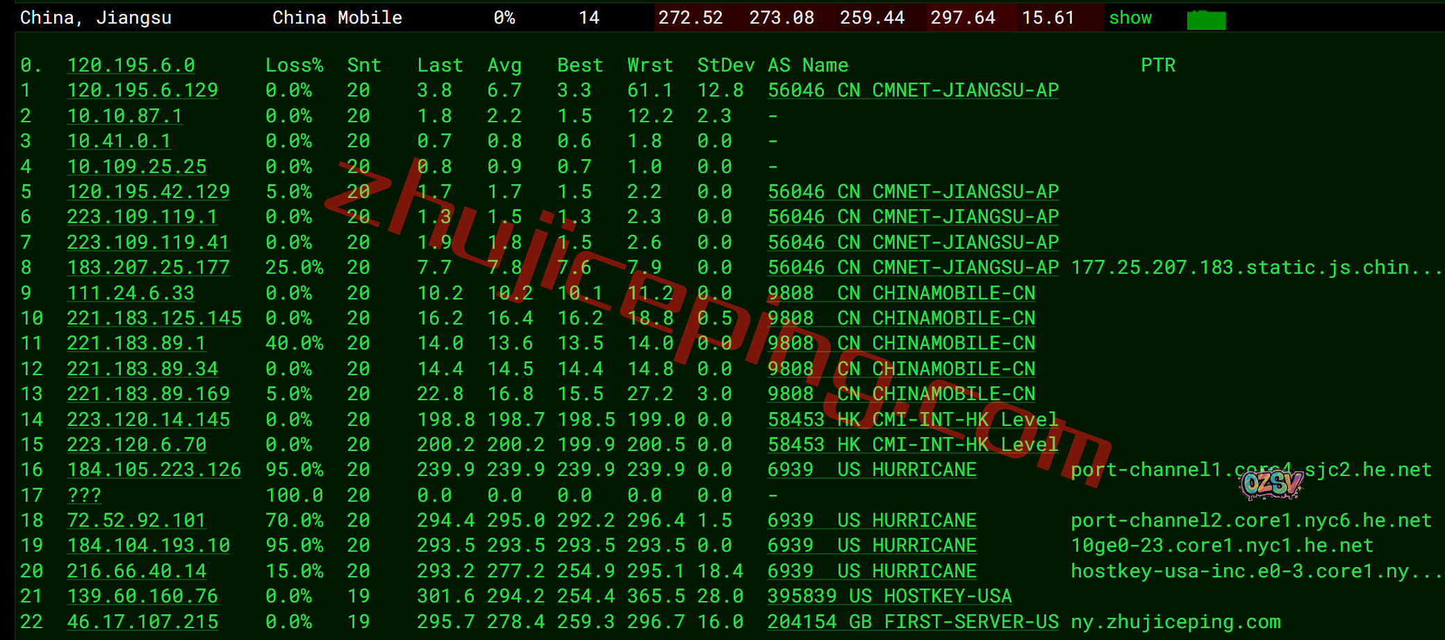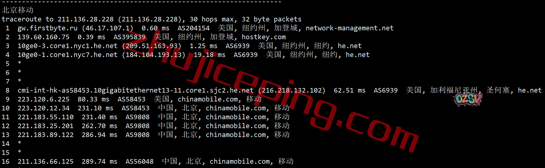 移动去程:直连移动圣何塞节点,然后走HE一路去纽约
