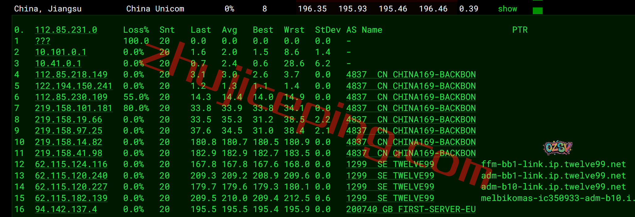联通去程:直连联通法兰克福节点,然后转twelve99去荷兰