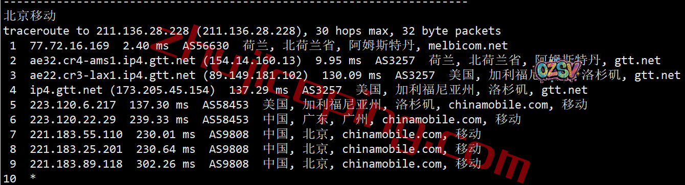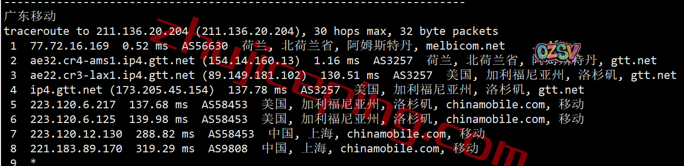 移动去程:直连移动法兰克福节点,然后走level3去荷兰阿姆斯特丹