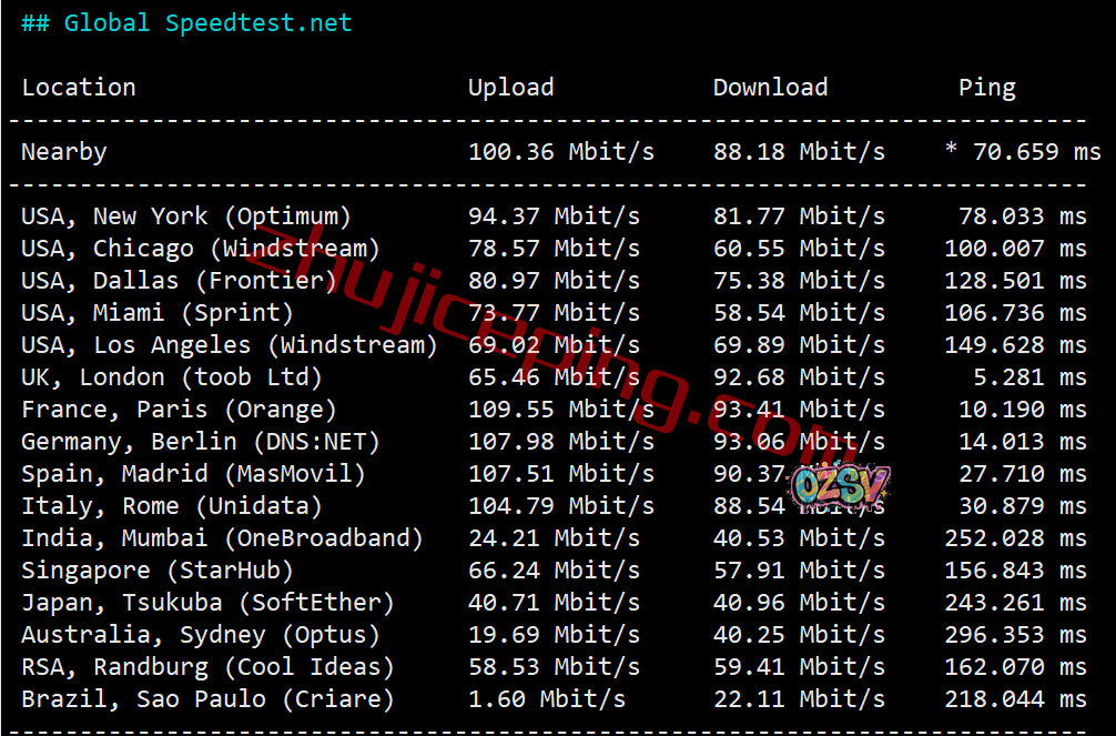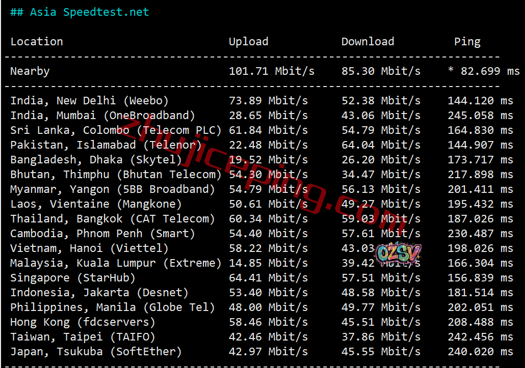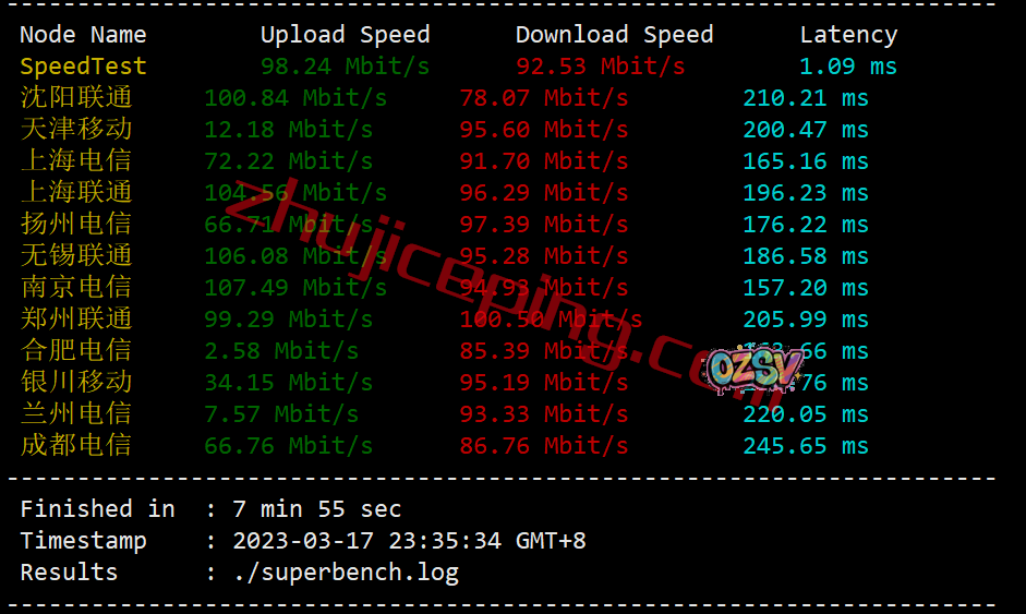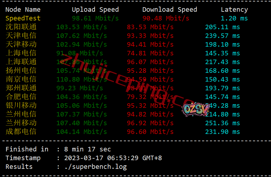 用speedtest.net的国内三网节点跑一下上下行带宽,大致数据如下: