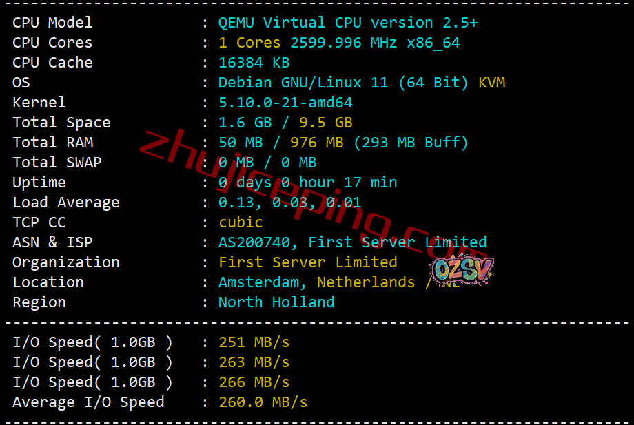 本次使用最低配100M带宽的VPS写的测评!CPU主频2.6GHz(型号未知),IP归属荷兰阿姆斯特丹,硬盘I/O大致260MB/S: