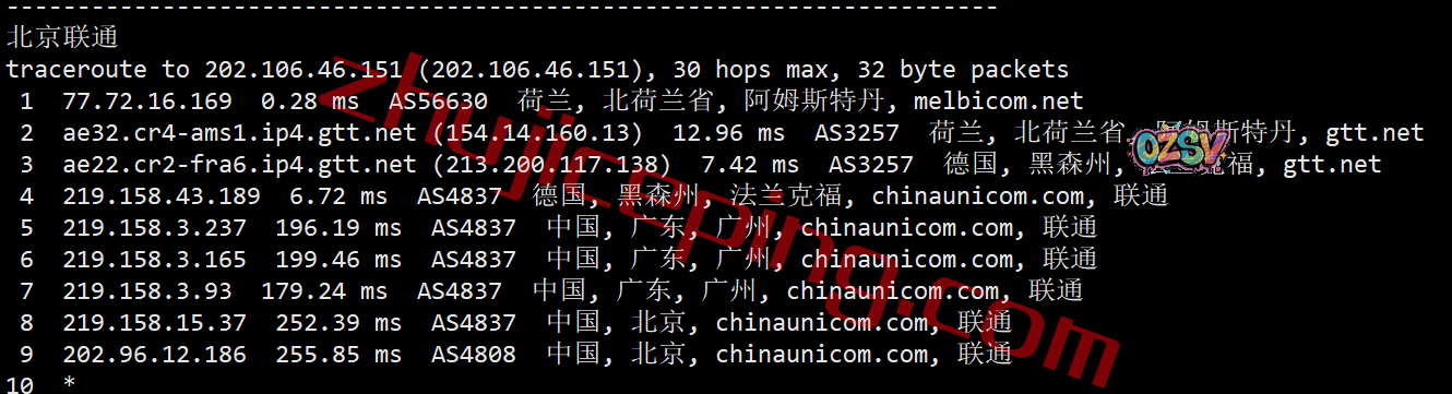 北京/上海方向:走GTT到德国,从联通法兰克福节点直连回国