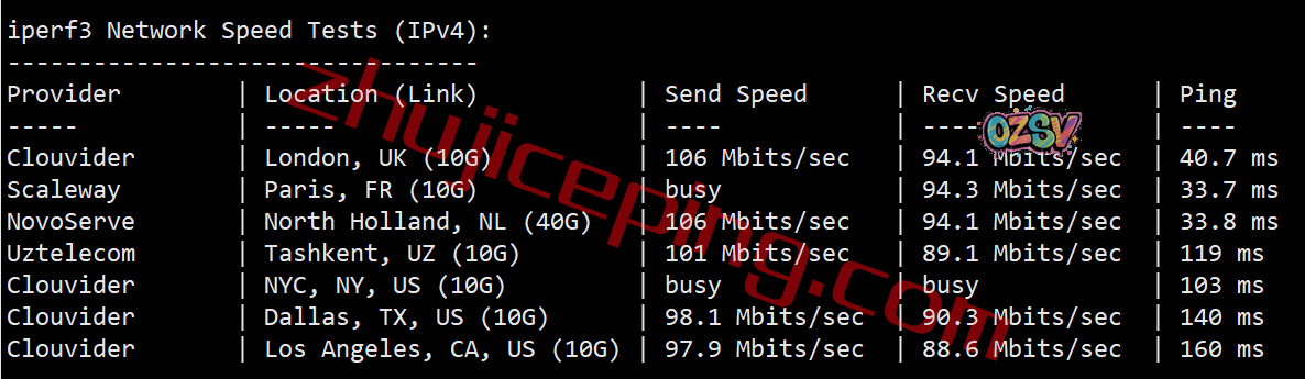 测试用的是索菲亚机房的最低配(100M带宽)这款,我们用speedtest.net在国内的三网节点跑一下上下行,看看可以达到多少?大致数据:
