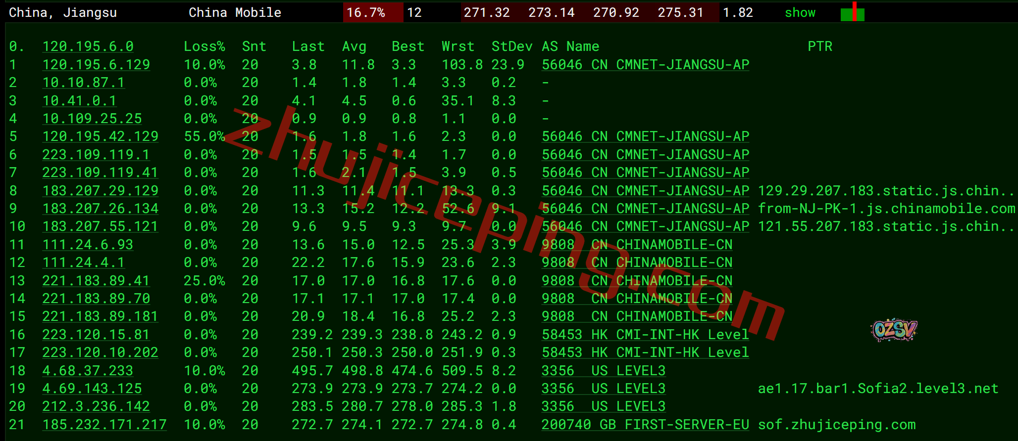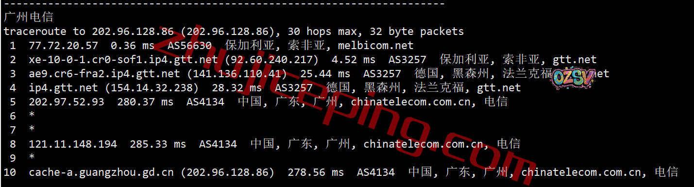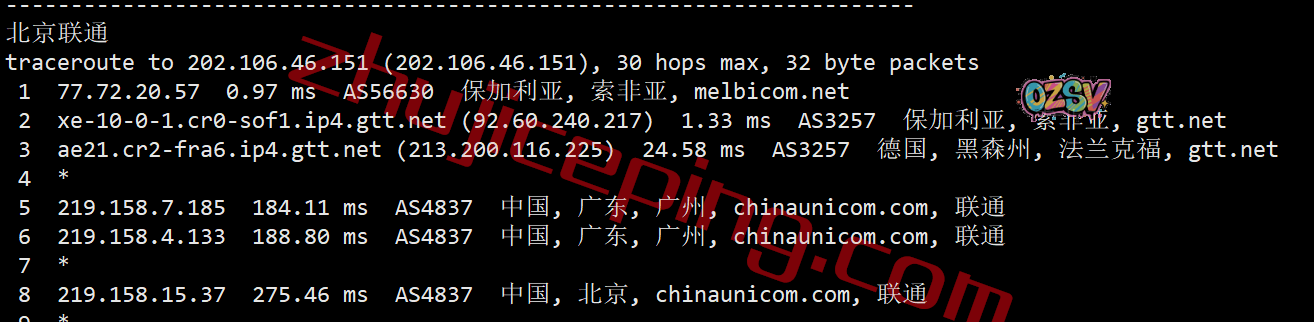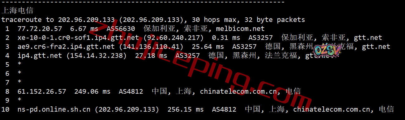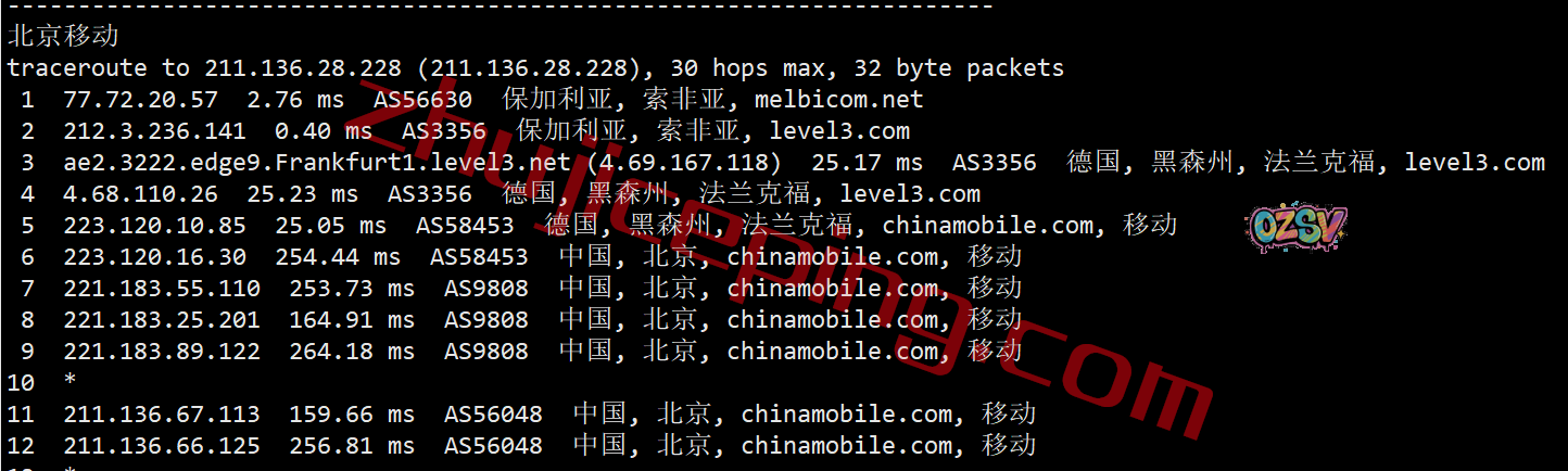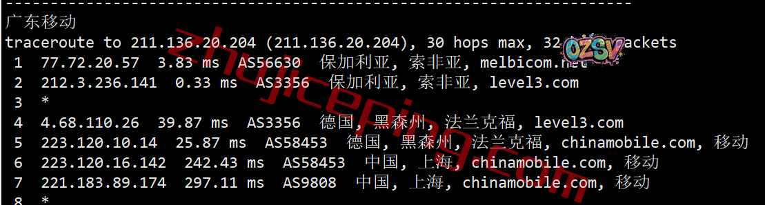 移动回程:全部走level3到德国法兰克福,然后从移动法兰克福节点直连回国