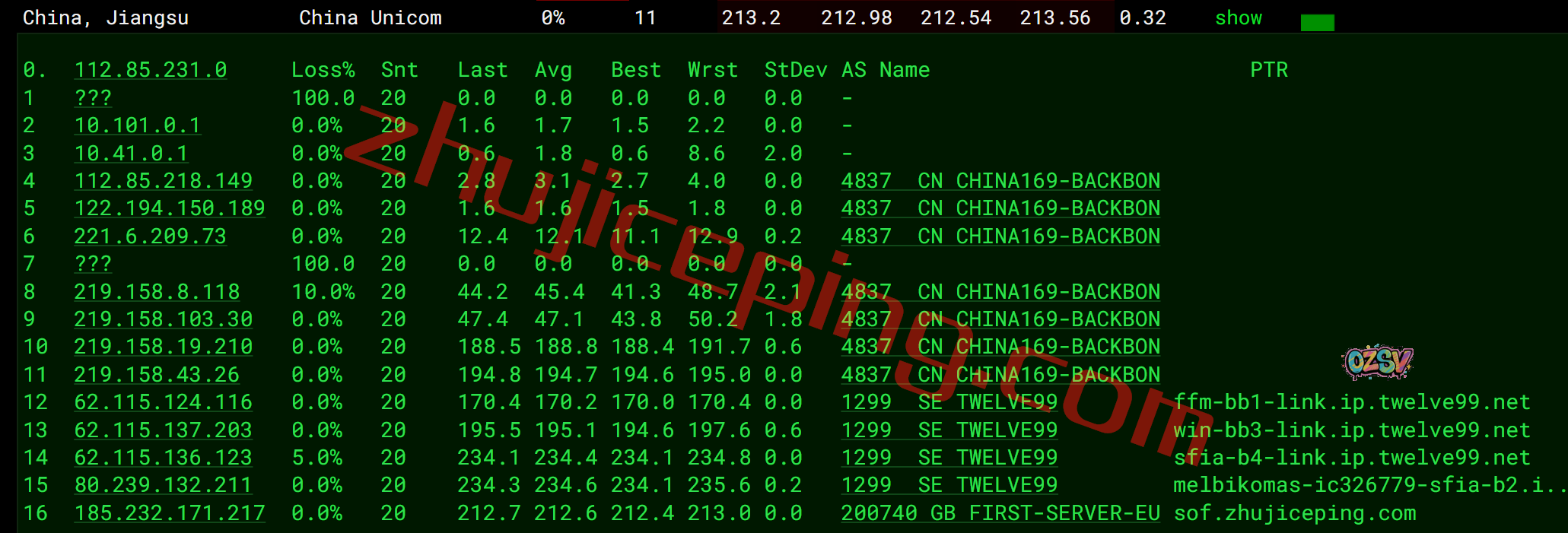 联通去程:直连联通法兰克福节点然后转twelve99去取保加利亚