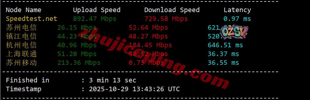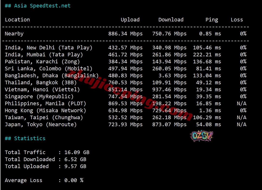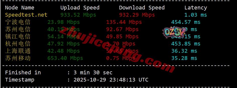 SpeedTest.Net的部分亚洲境内节点的带宽上下行及延迟测试数据: