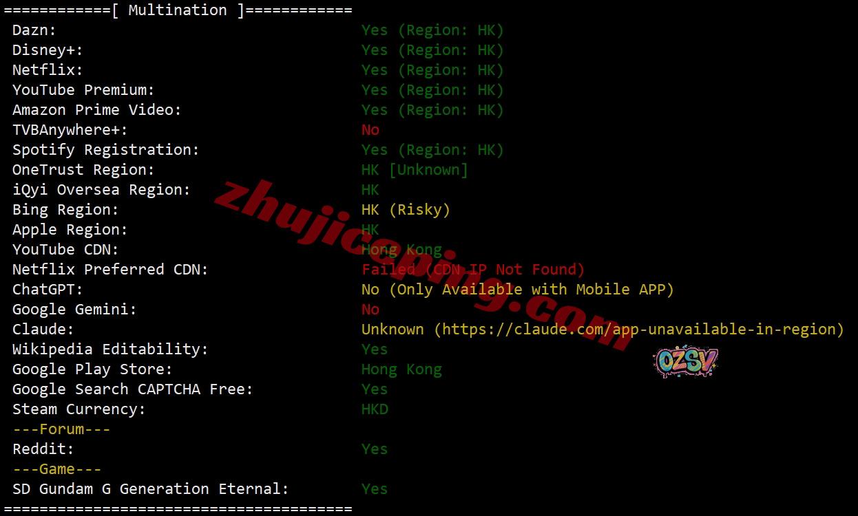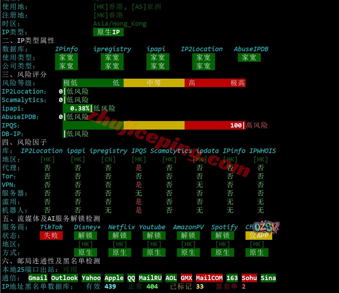 多个数据库对IP属性的大致判断:原生香港IP,家宽属性,tiktok/chatgpt禁止香港访问,其余解锁几乎都没问题