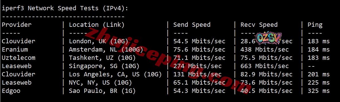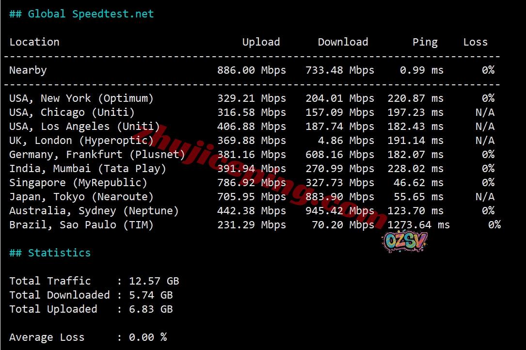 SpeedTest.Net的部分国际节点的带宽上下行及延迟测试数据: