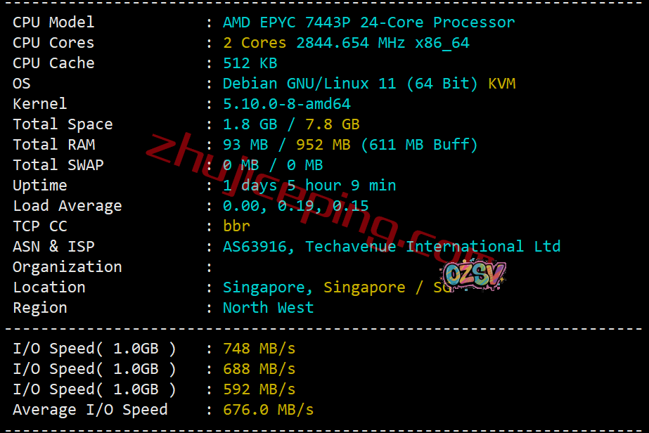 站长选择的是最低配的VPS最测评,我们大致能看到的是CPU是AMD EPYC 7443P(24核、48线程,主频2.85GHz、最高加速频率为4.0GHz),站长启用了BBR,IP归属新加坡,当前硬盘I/O大致676MB/S: