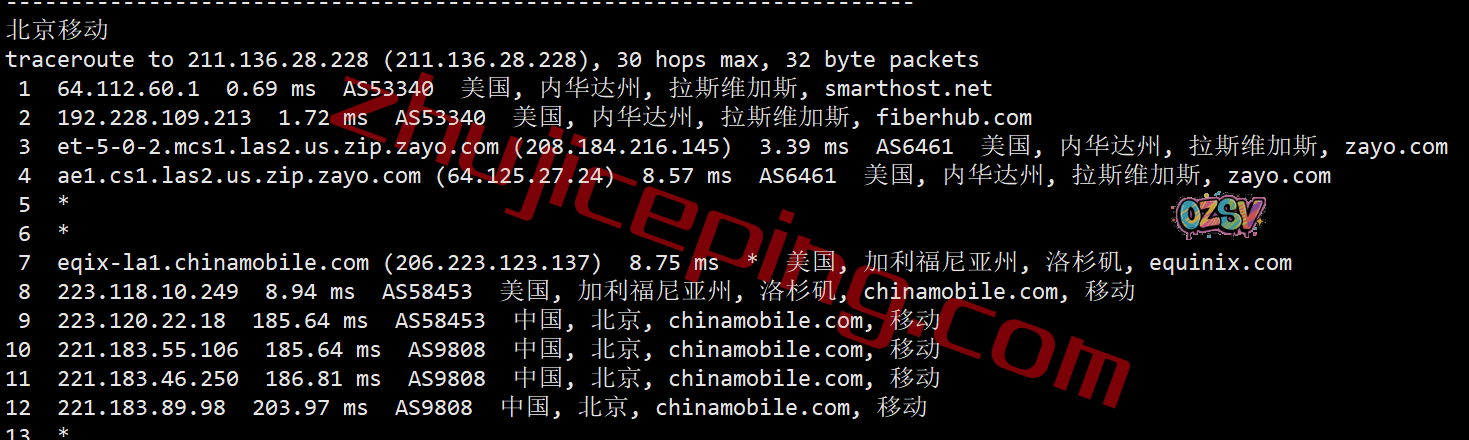 移动去程:直连移动洛杉矶节点,然后转zayo经过洛杉矶去拉斯维加斯