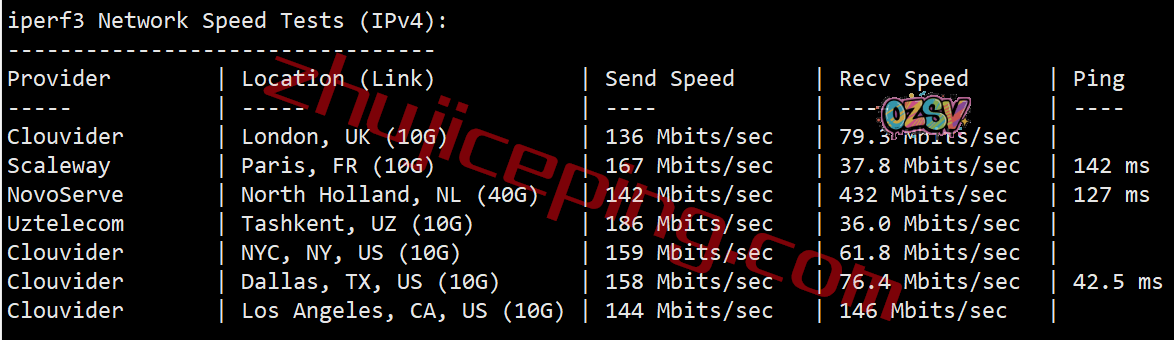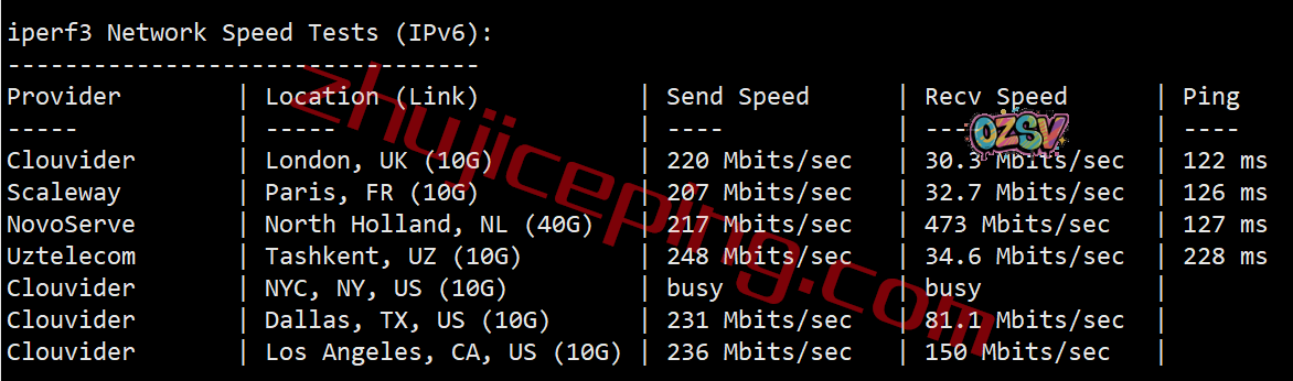 iperf3测试,IPv6环境下测试几个欧美节点,大致数据: