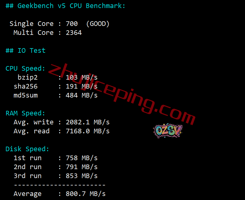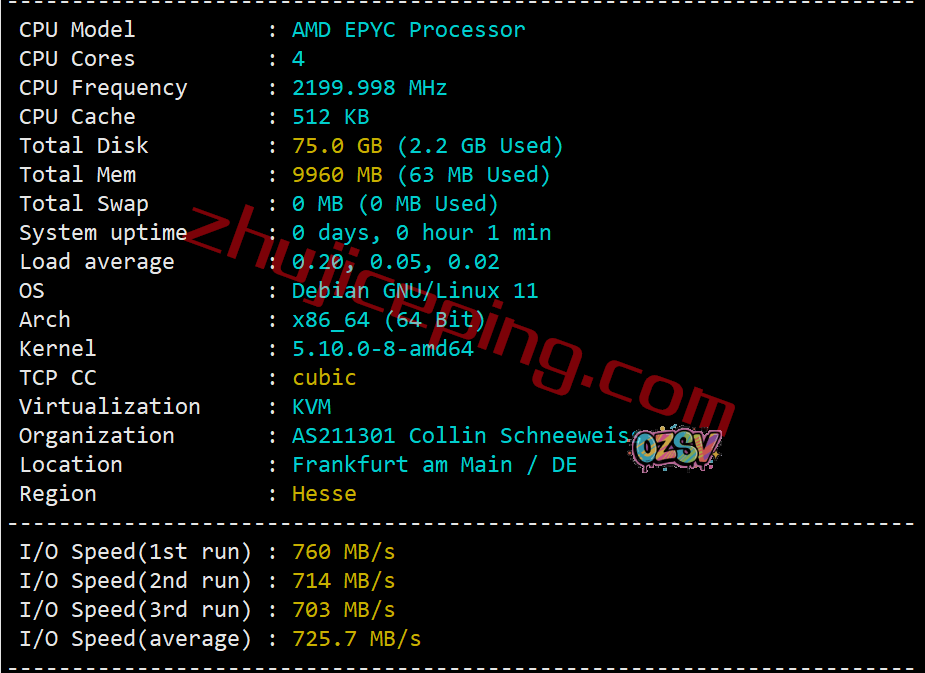 本次测试用的是促销款的VPS,CPU型号具体未知,大致就知道是EPYC,主频2.2GHz,IP归属德国,硬盘I/O大致725MB/S的样子: