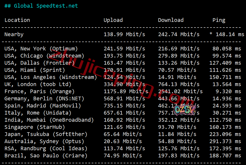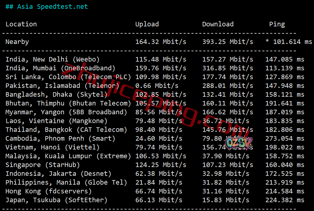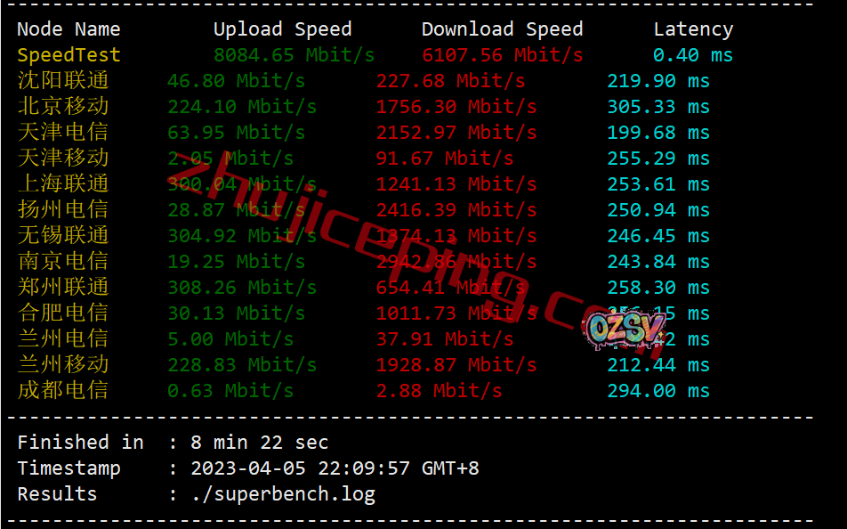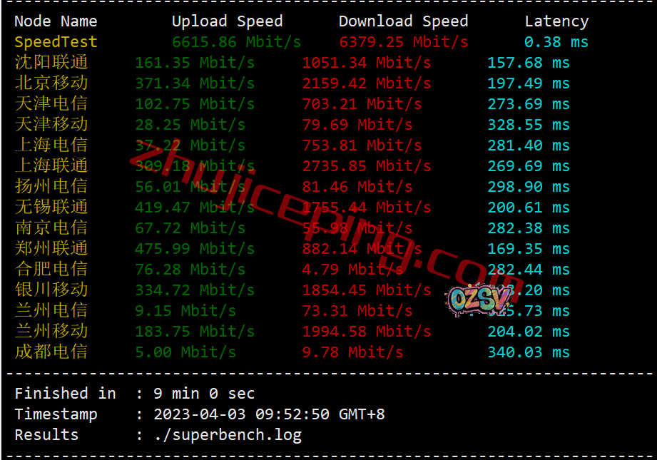 默认是10Gbps带宽,用speedtest在国内的三网节点来跑一下上下行,看看能到多少?大致数据: