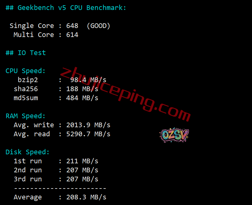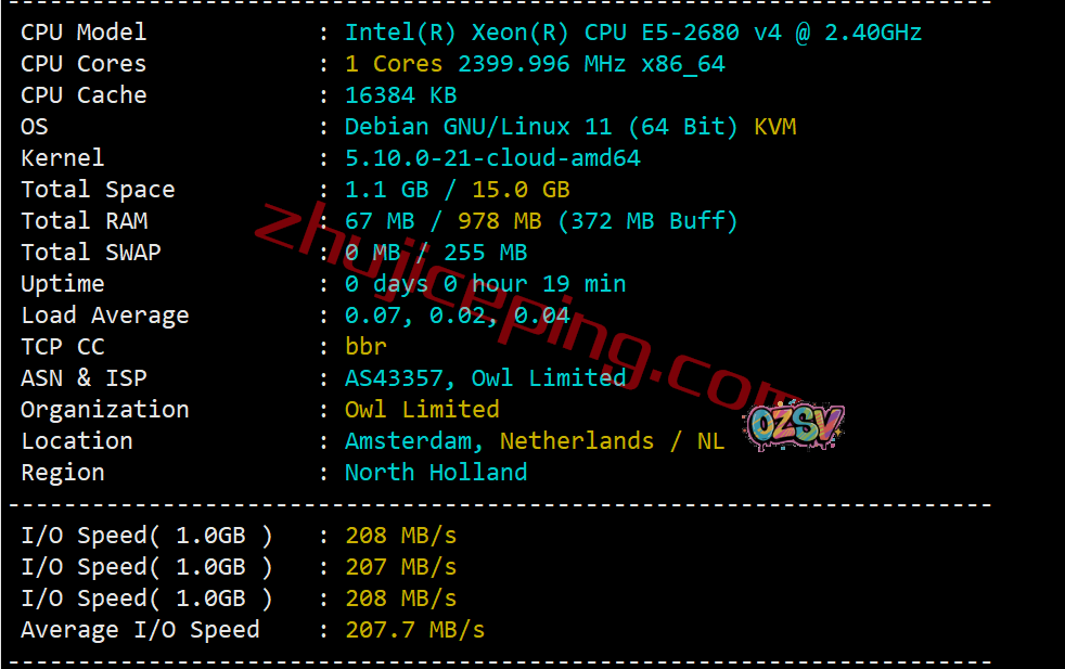 从拿到的小鸡来看,CPU型号是e5-2680v4(主频2.4GHz),启用了BBR,IP归属荷兰,当前硬盘I/O大致在207MB/S的样子: