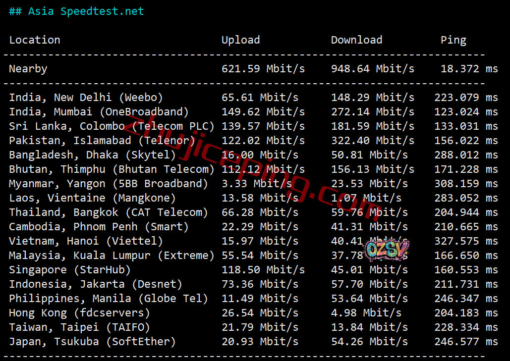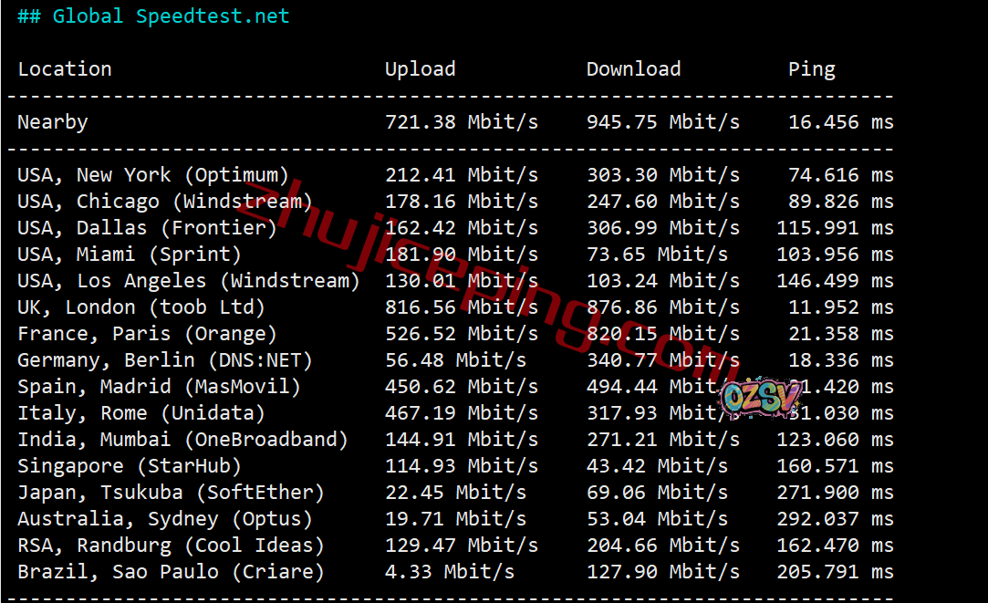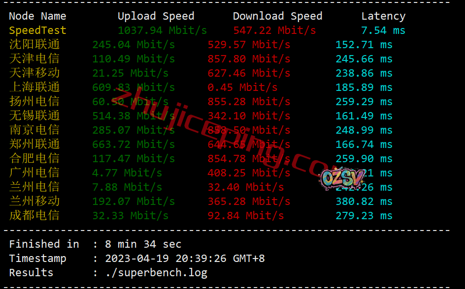 用speedtest.net在国内的三网多节点跑一下上下行,大致看看: