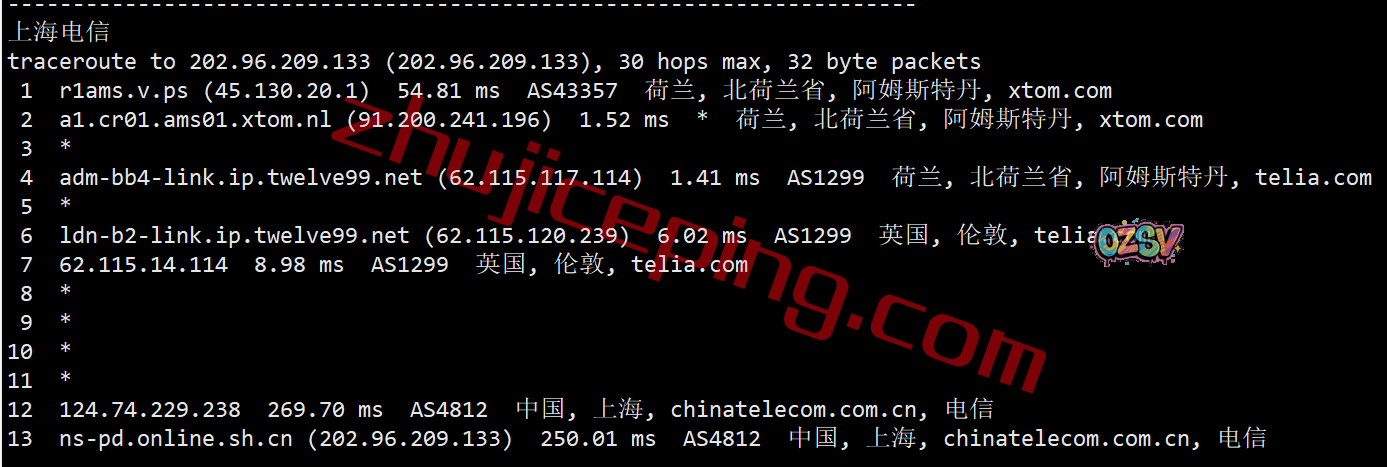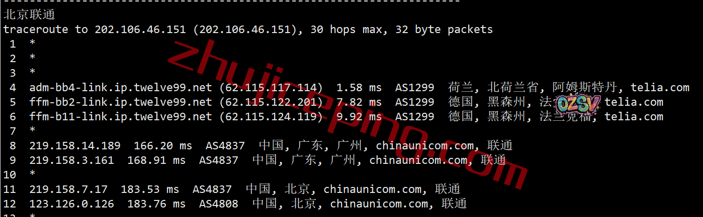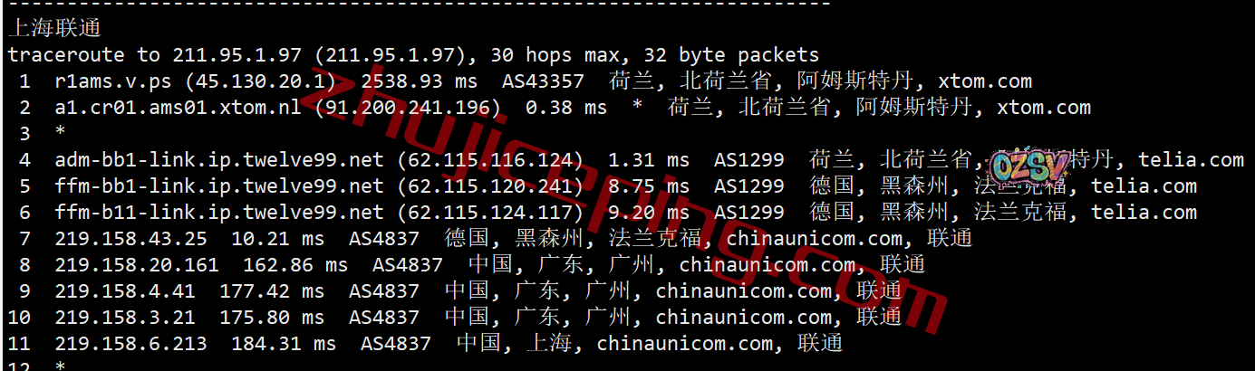 上海方向:走telia到法兰克福,从联通法兰克福节点直连回国