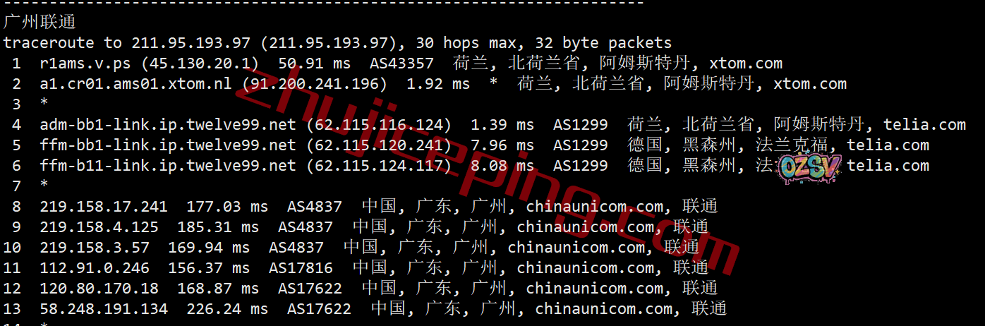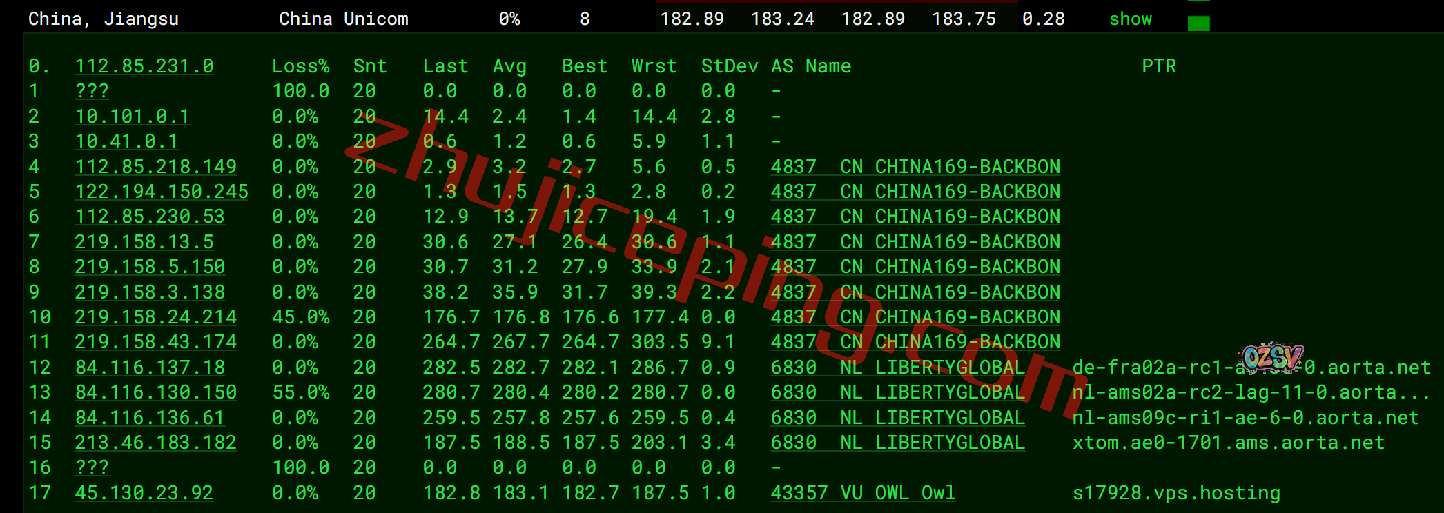 联通去程:直连联通法兰克福节点然后走aorta过去荷兰