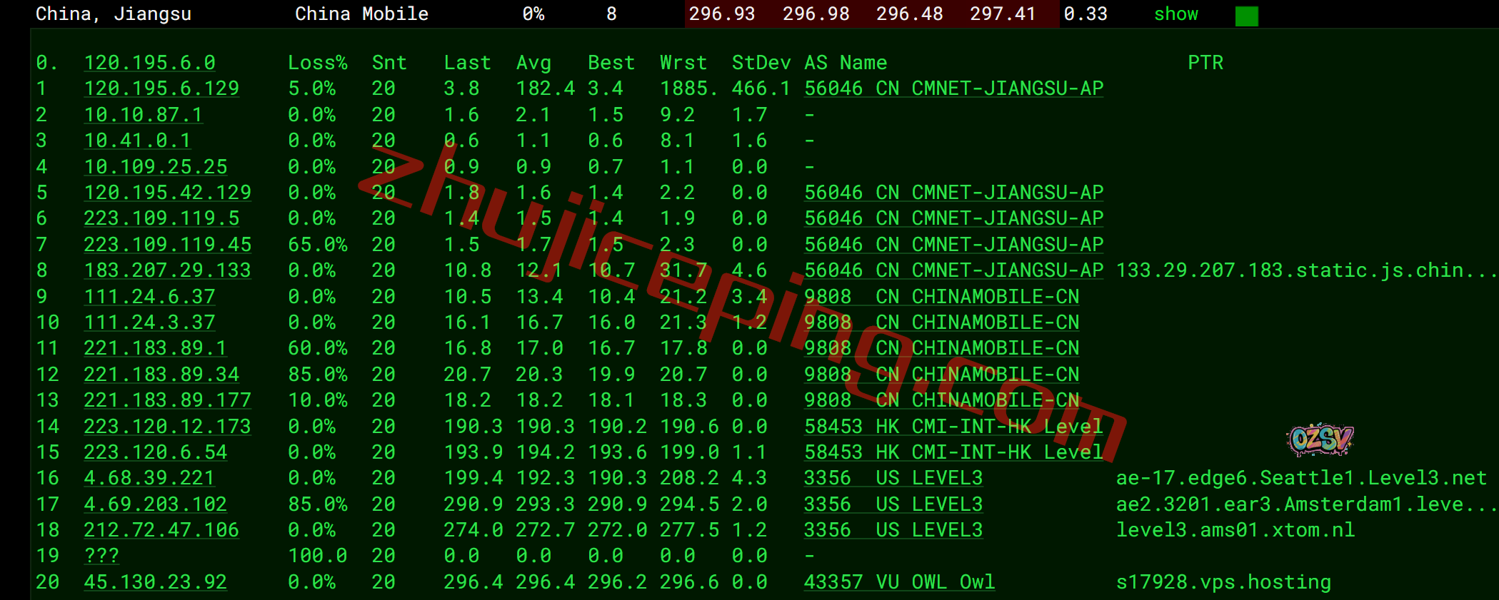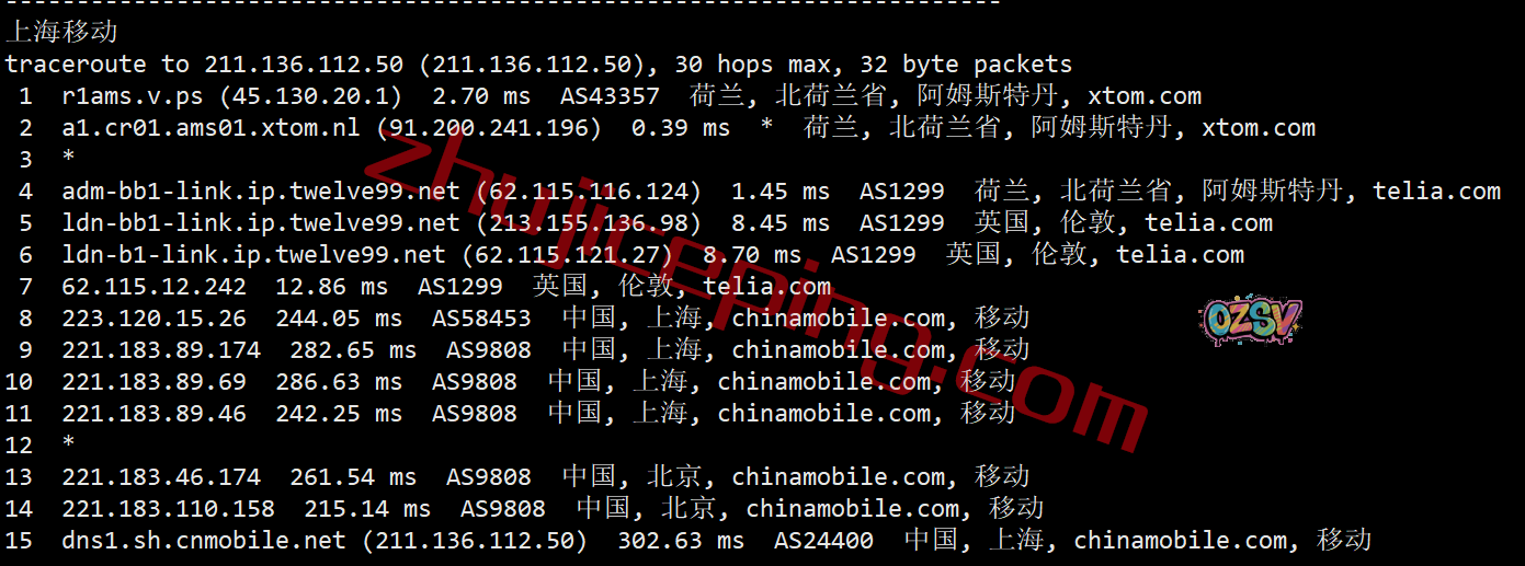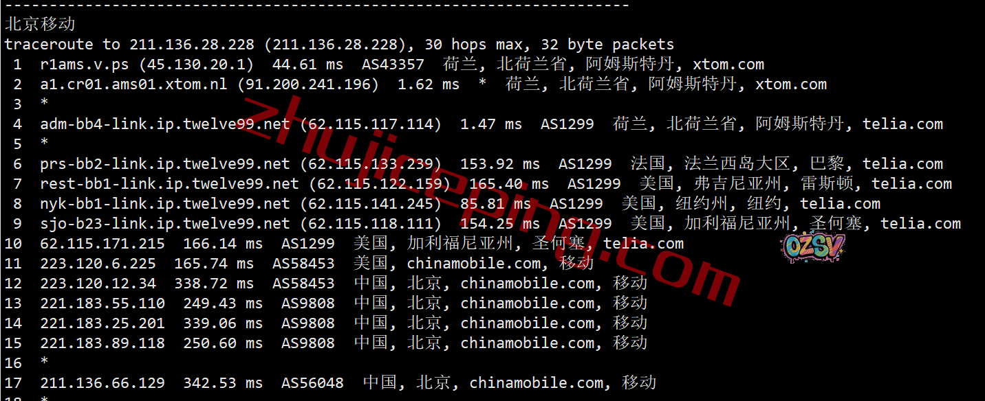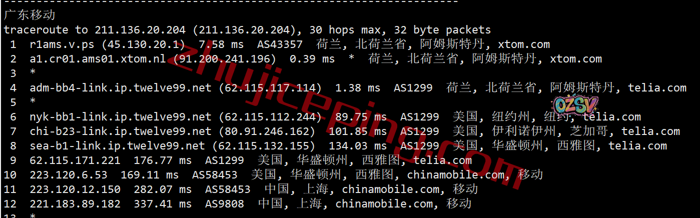 移动去程:直连移动西雅图节点,然后走level3去荷兰