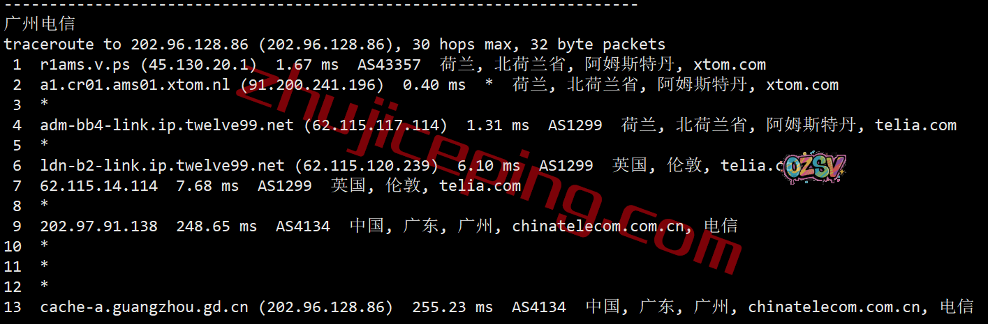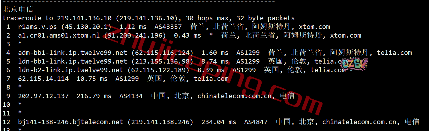 电信回程:走telia经过英国伦敦回国内,纯国际线路