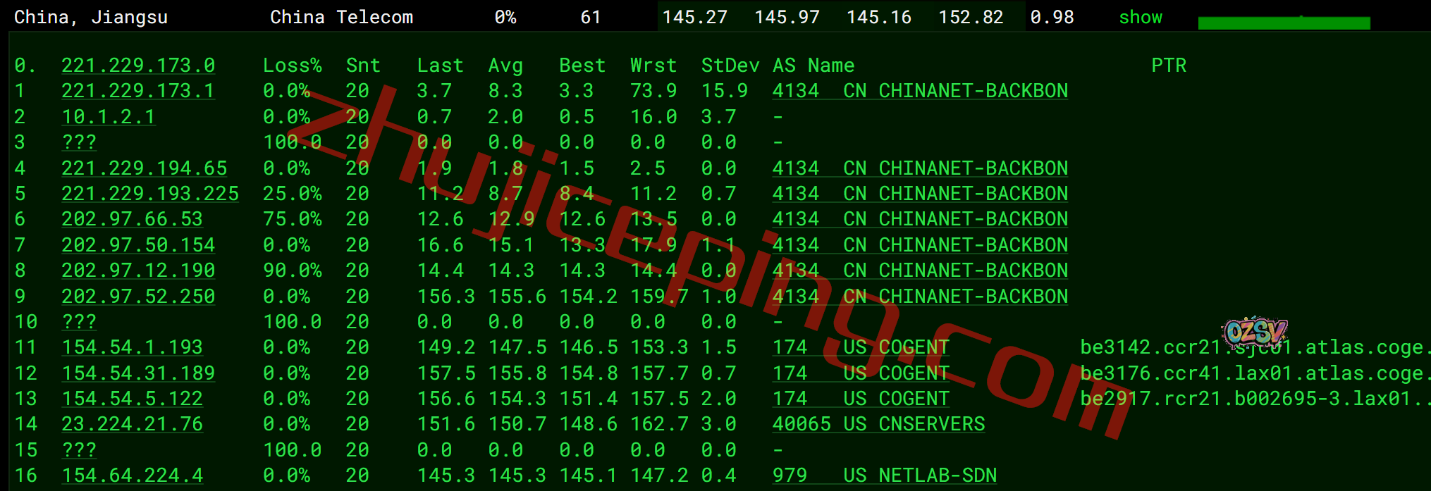 网络方面,三网去程全部都是骨干直连西海岸后接的大带宽运用上比如HE\COGENT等,为了高防没办法…回程,三网强制AS9929…