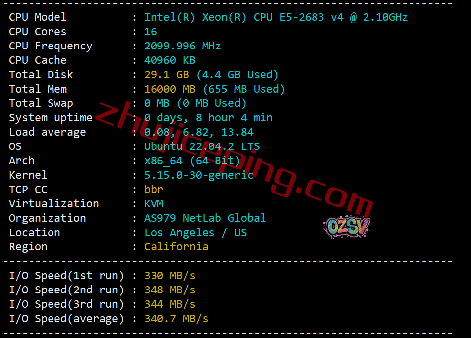 默认CPU为e5-2683v4,2.1GHz主频,站长启用了BBR,IP归属美国加州洛杉矶,当前硬盘I/O大致在340MB/S的样子: