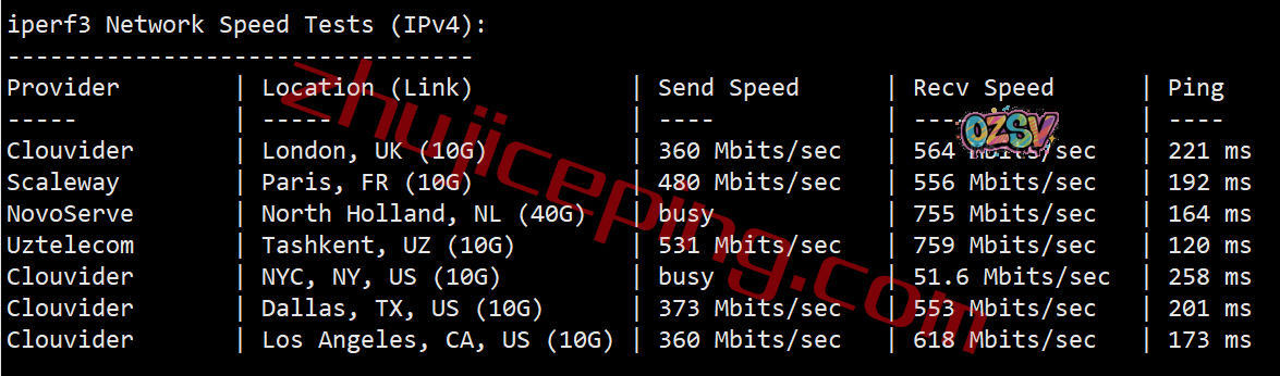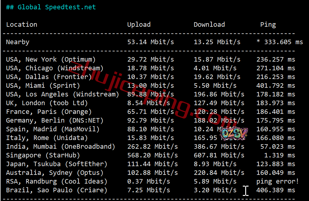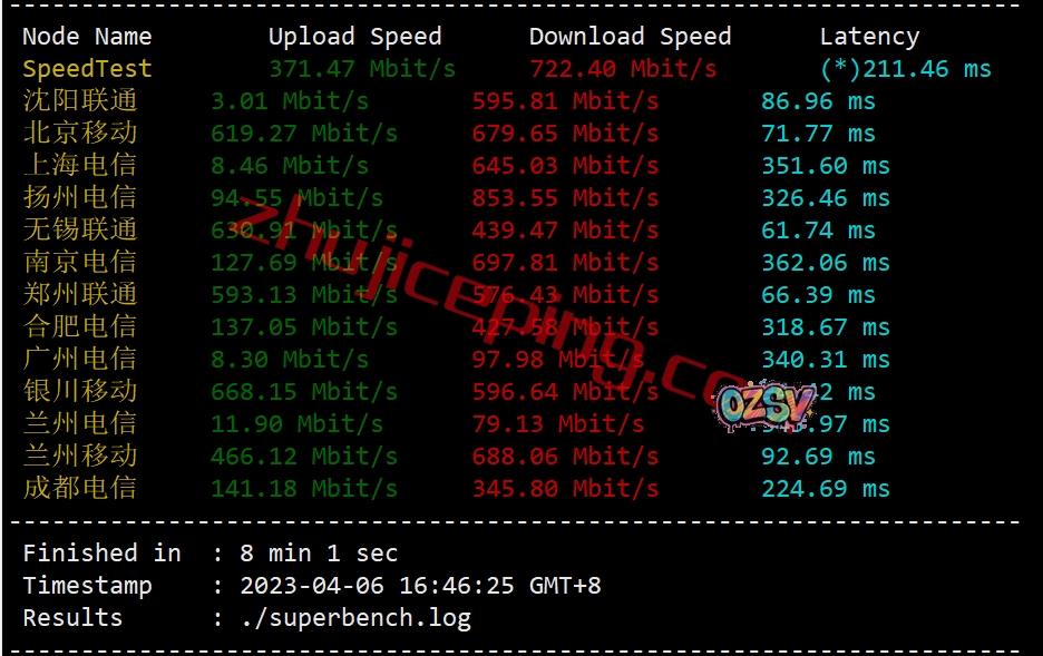 speedtest的国内三网节点测试跑起来,看看在国内上下行能冲到多少吧?如下数据: