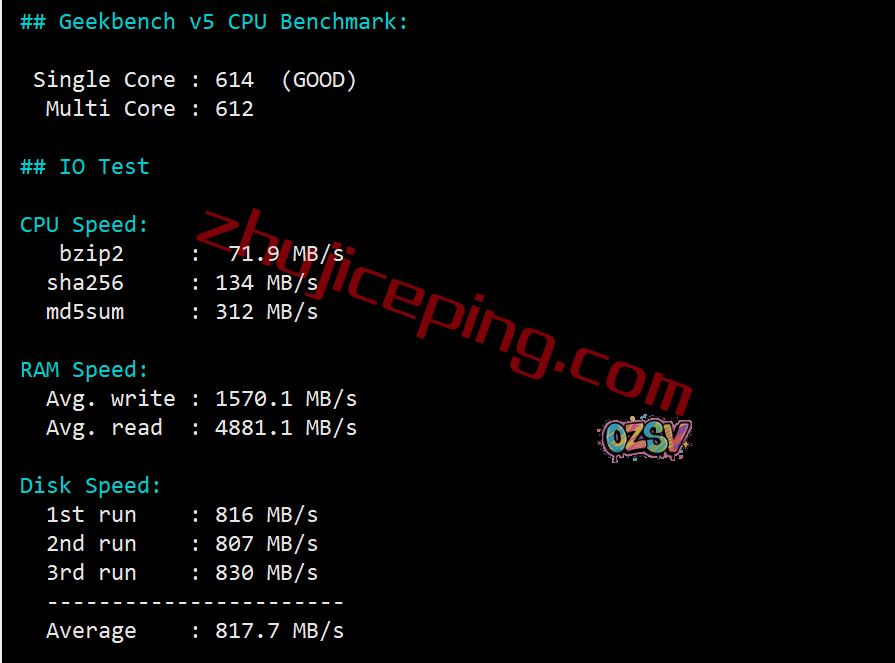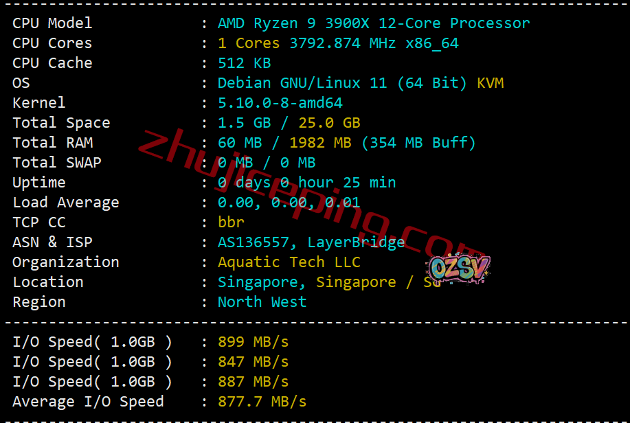 CPU为AMD Ryzen 9 3900X,主频3.8GHz,站长习惯性启用了BBR,IP归属新加坡,当前硬盘I/O大致877MB/S的样子: