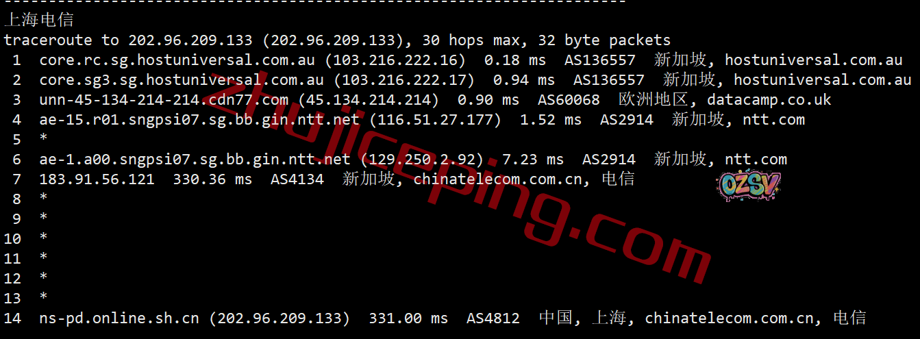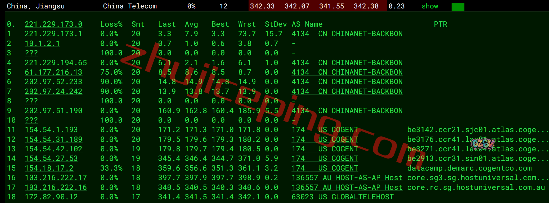 电信去程:直连电信圣何塞节点,然后转cogent去洛杉矶再去新加坡