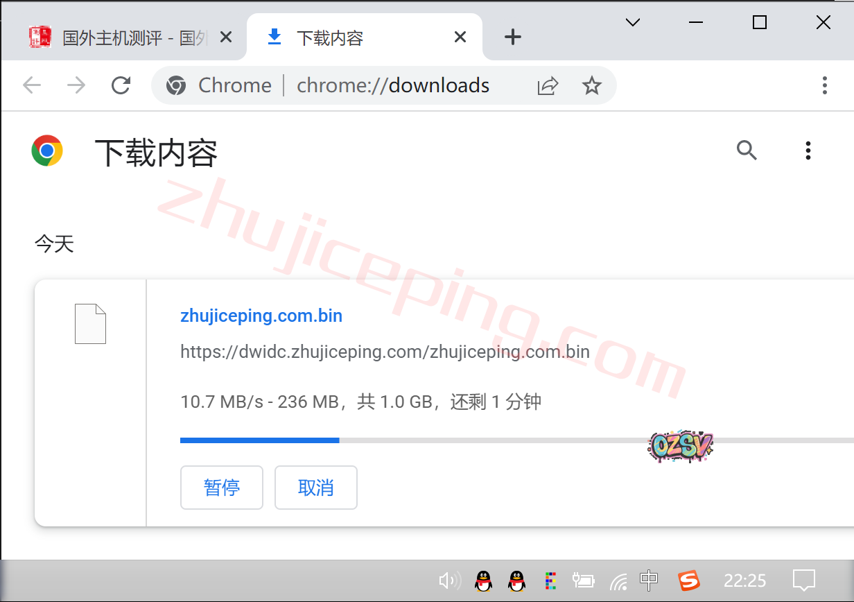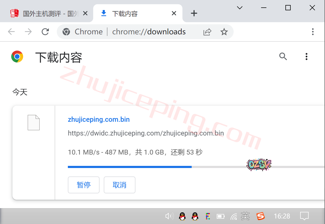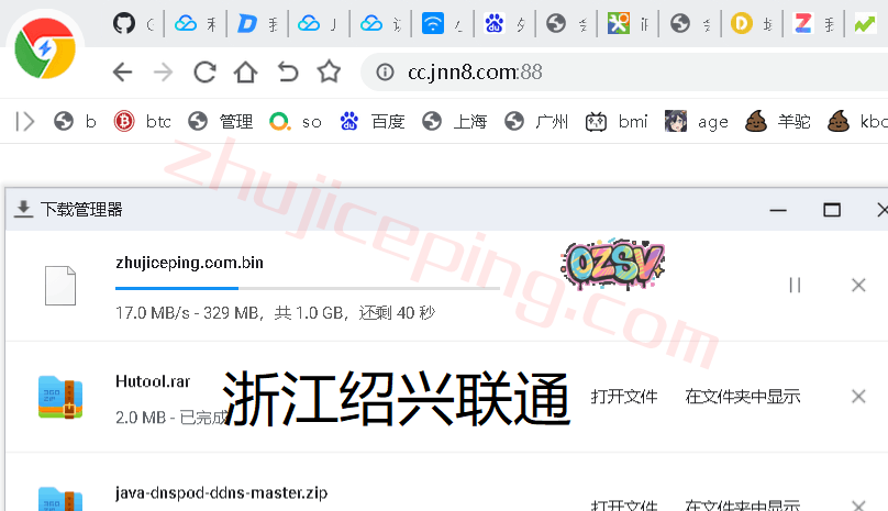 站长的广州电信家宽只有100Mbps,我们用浏览器下载存放在测试小鸡上面的文件,看看下载速度吧,大致接近跑满吧: