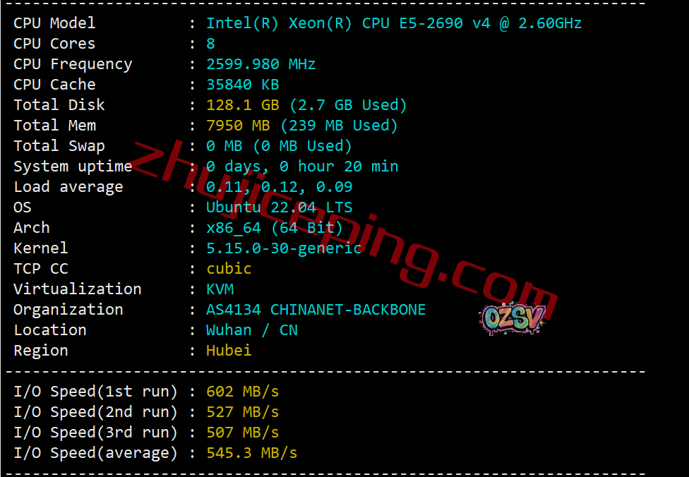 站长弄了个8G内存、8核、2Gbps带宽的云服务器,e5-2690v4(2.6GHz主频)的CPU还不错,AS4134这个大家熟啊,当前硬盘I/O大致在545MB/S的样子: