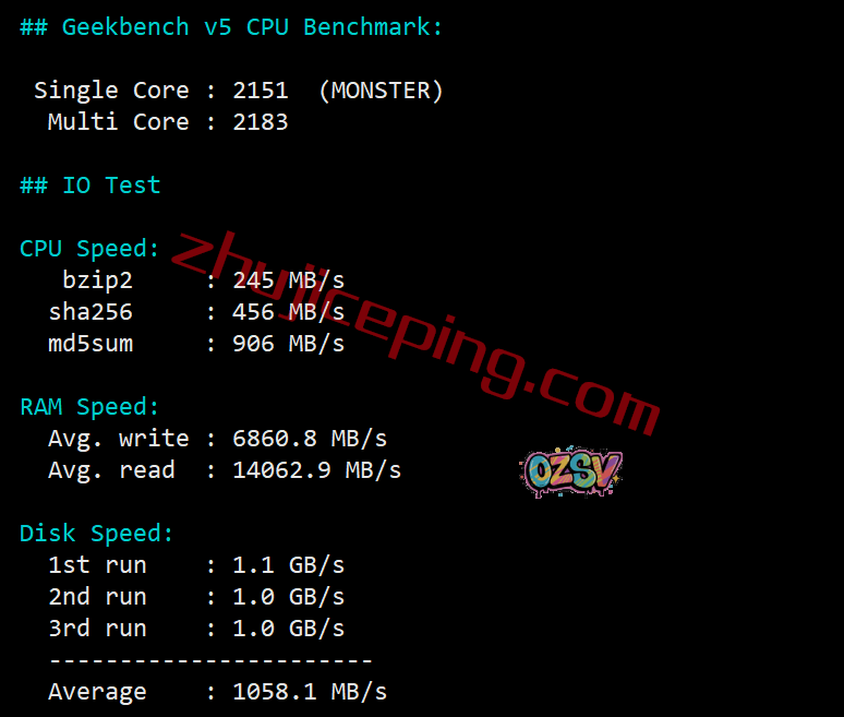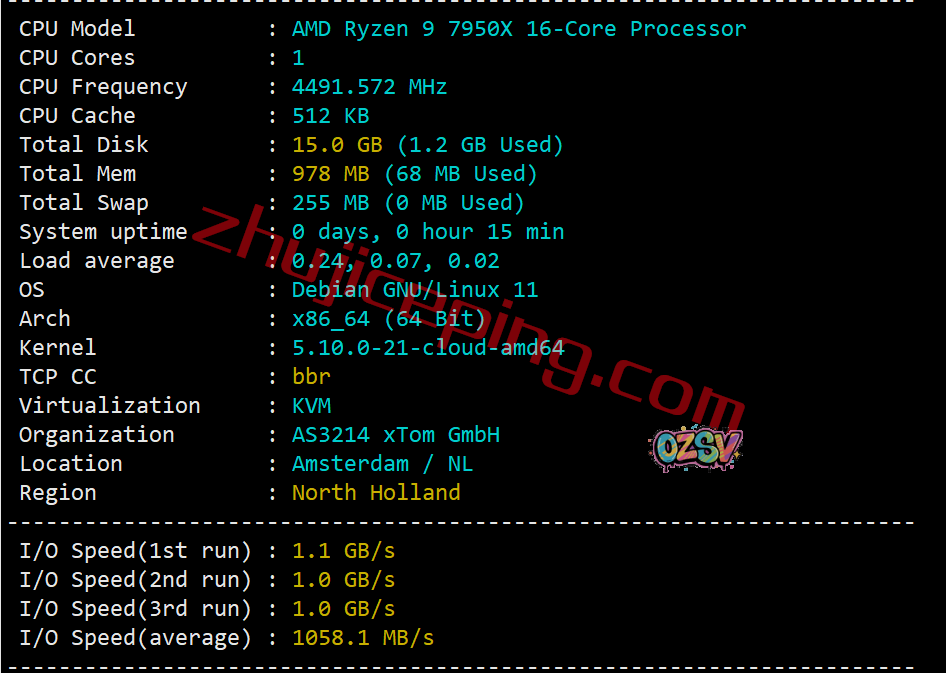 CPU为AMD Ryzen 9 7950X,主频4.5GHz,站长启用了BBR,IP归属荷兰,当前硬盘I/O大致在1058MB/S的样子: