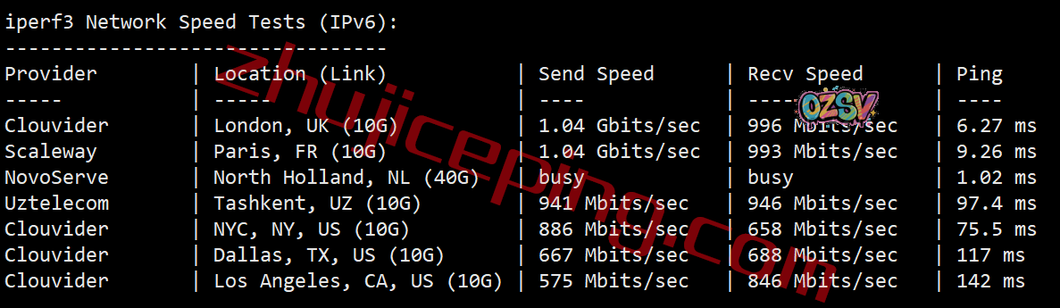 iperf3,IPv6环境下,测试几个欧美节点的数据: