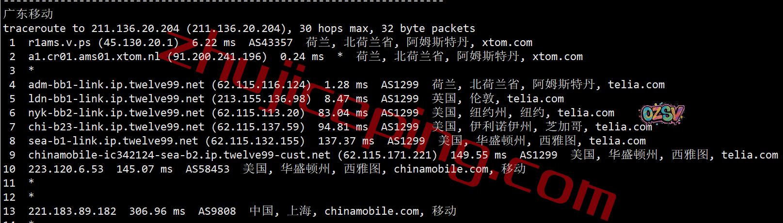 广州方向:从荷兰走telia到美国东岸后去西雅图,从移动与telia在西雅图的pop出来直连回国