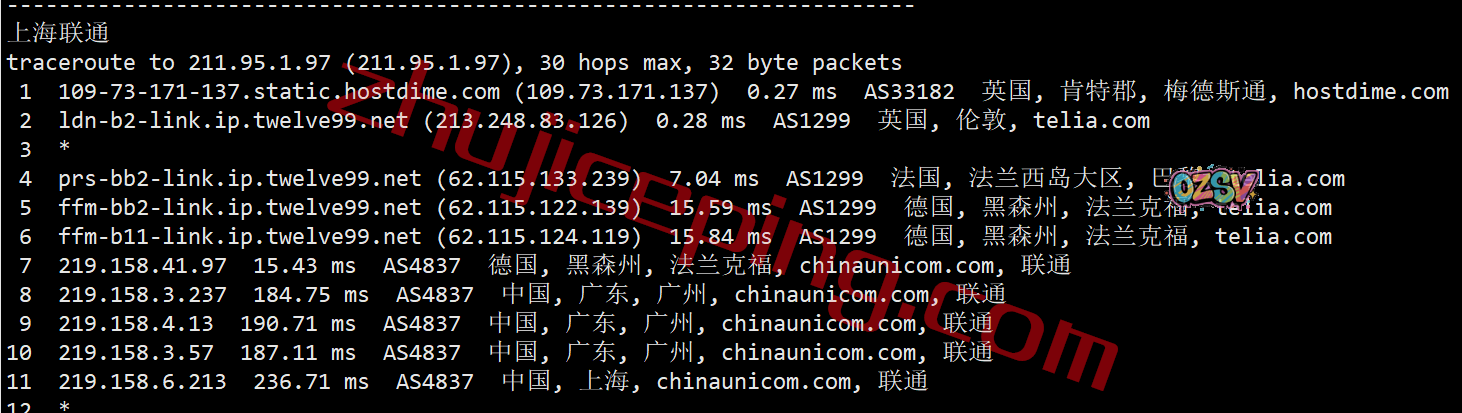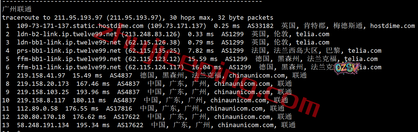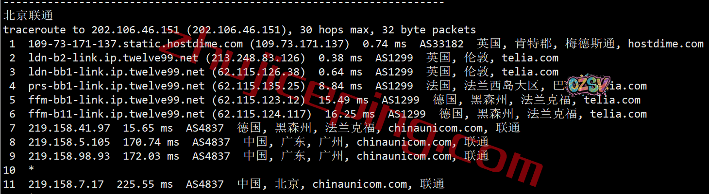联通回程:走telia经过法国、德国,从联通德国法兰克福节点直连回国