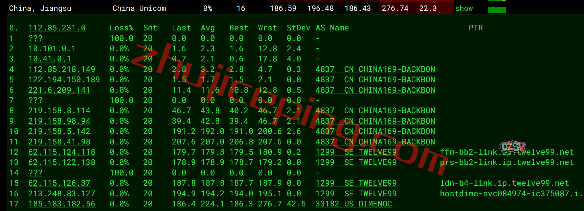 联通去程:直连联通法兰克福节点,然后走twelve99经过法国去英国
