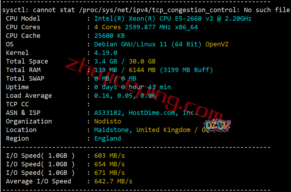 英国机房的服务器的CPU貌似用的是e5-2660v2(主频2.2GHz,加速3.0GHz,双路是20核40线程),由于是OpenVZ没有办法改变内核,没办法启用BBR,AS号貌似是知名机房hostdime的,当前I/O大致在642MB/S的样子: