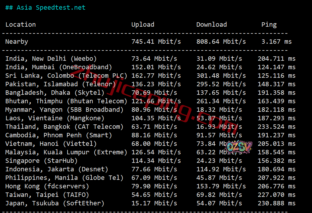 speedtest国际节点里面的亚洲部分节点的测试数据: