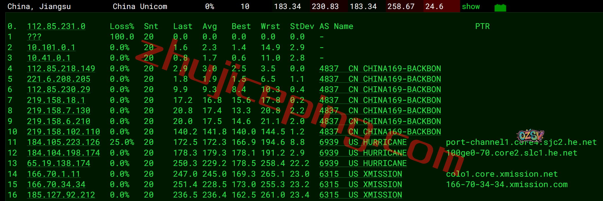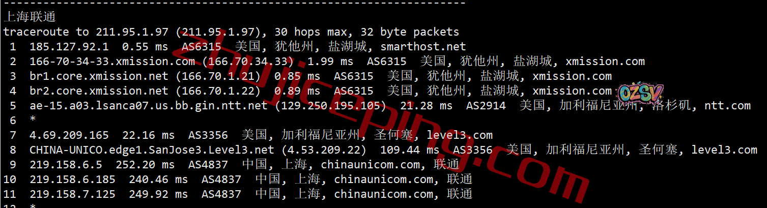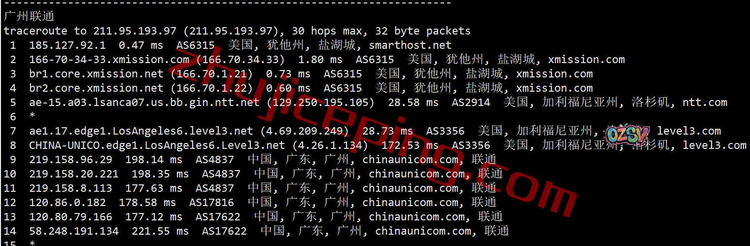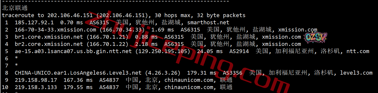 联通去程:直连联通圣何塞节点后走HE.net去盐湖城机房