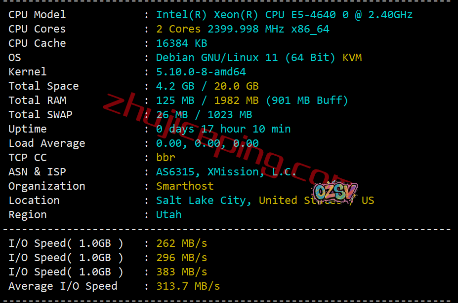 盐湖城的VPS貌似用的是e5-4640系列的CPU,主频2.4GHz,根据一般搞法这个CPU很多情况下都是4路出现的;站长开启了BBR,当前硬盘I/O大致是313MB/S的样子: