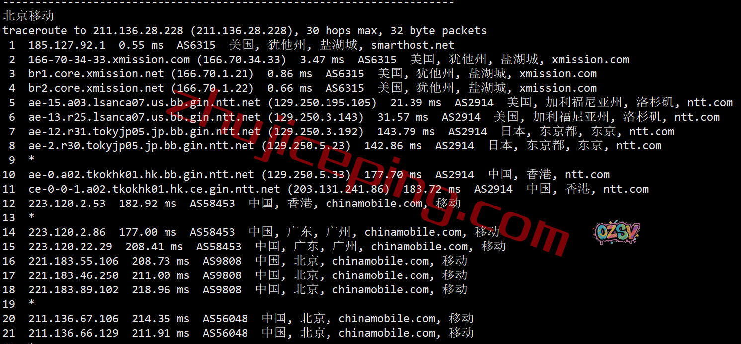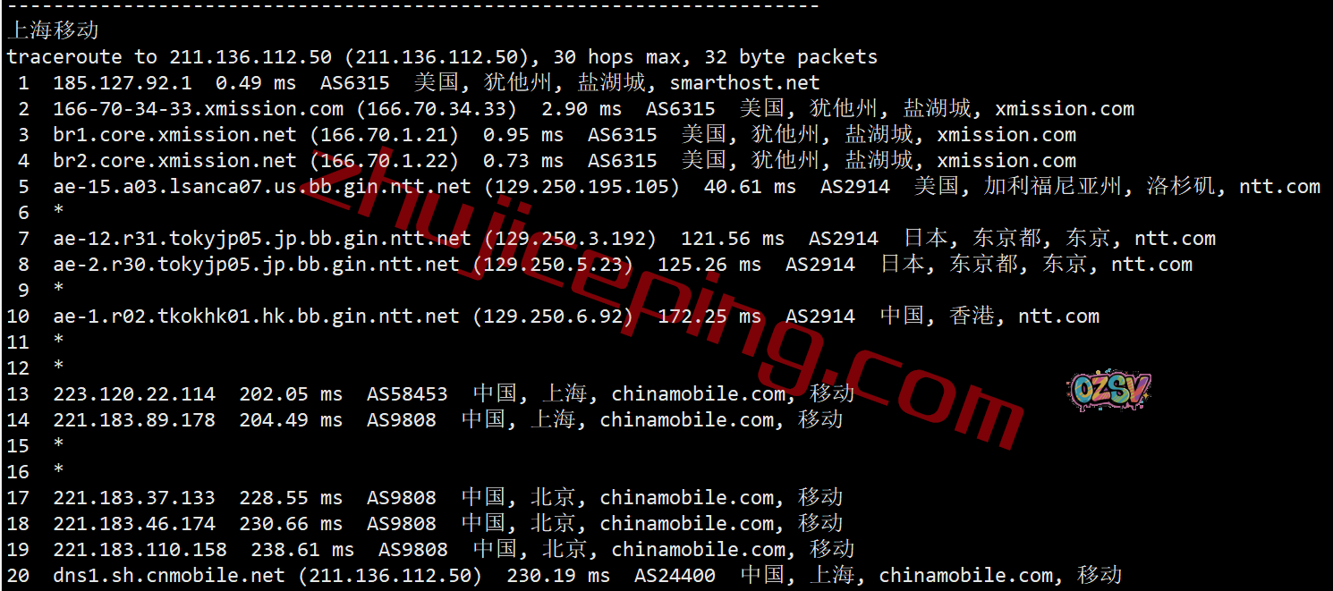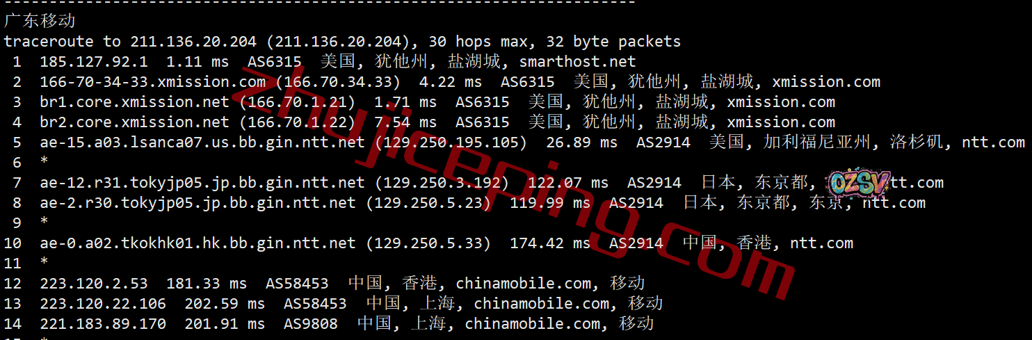 移动回程:走NTT到洛杉矶出海去日本东京然后到中国香港,接着从移动香港节点直回内地