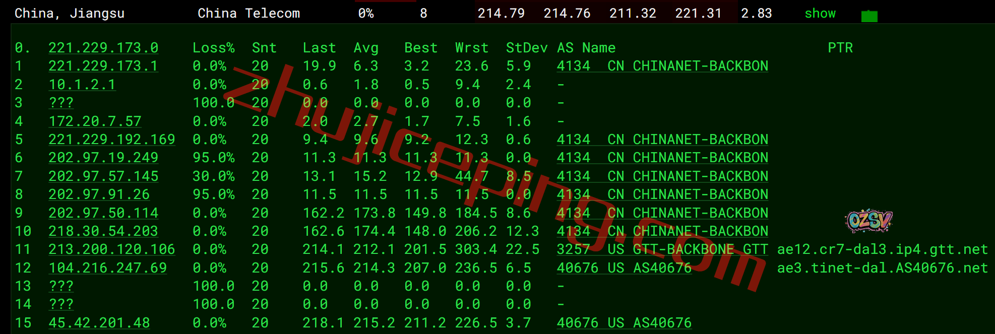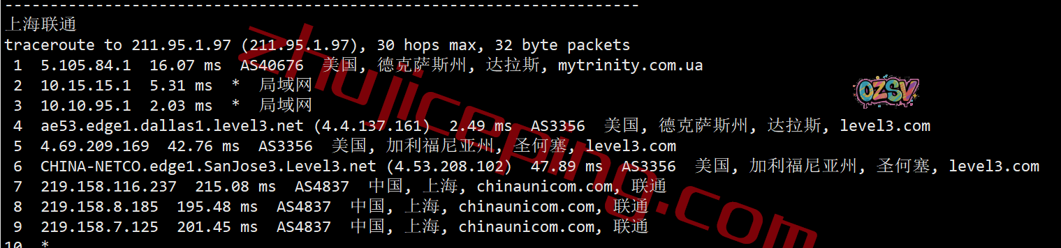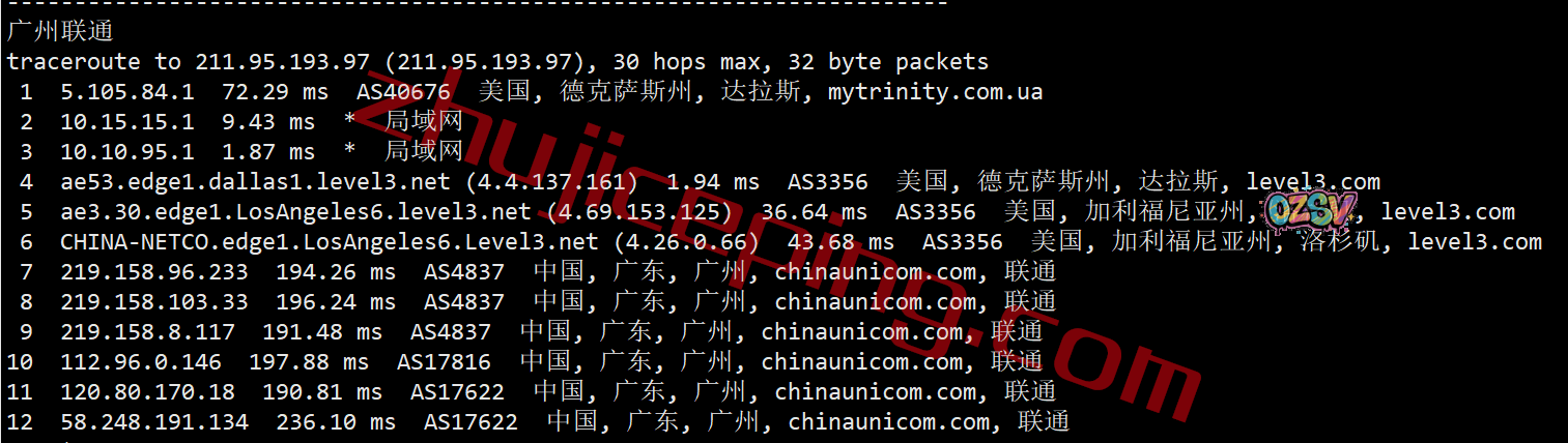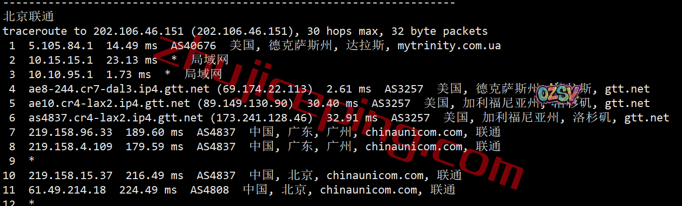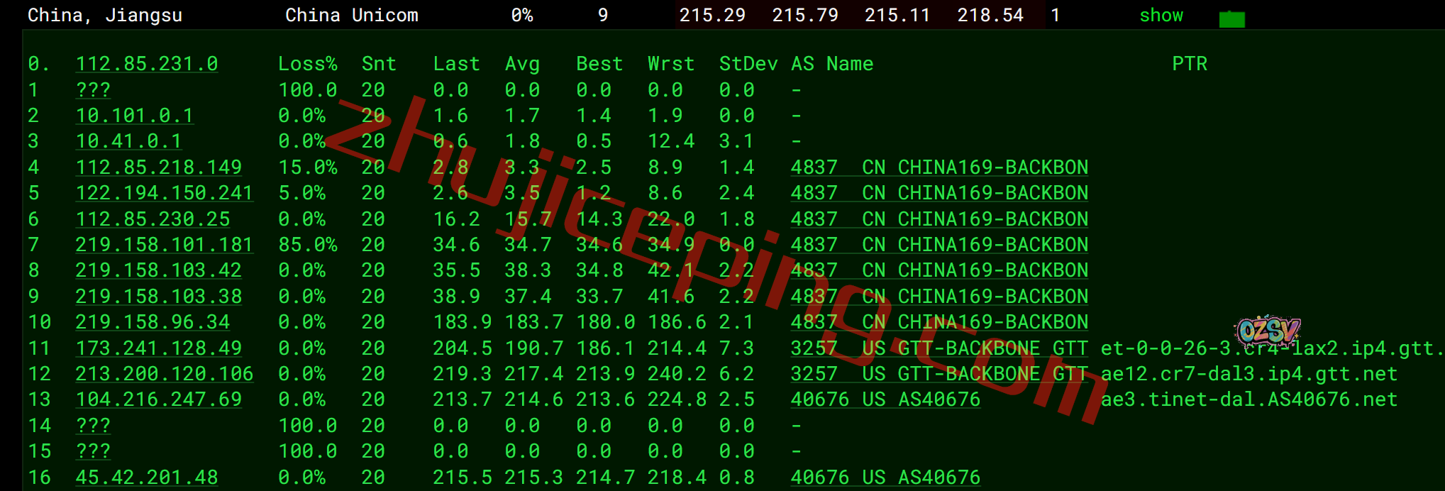 联通去程:直连联通洛杉矶节点后走GTT去达拉斯