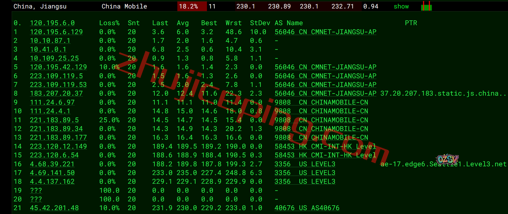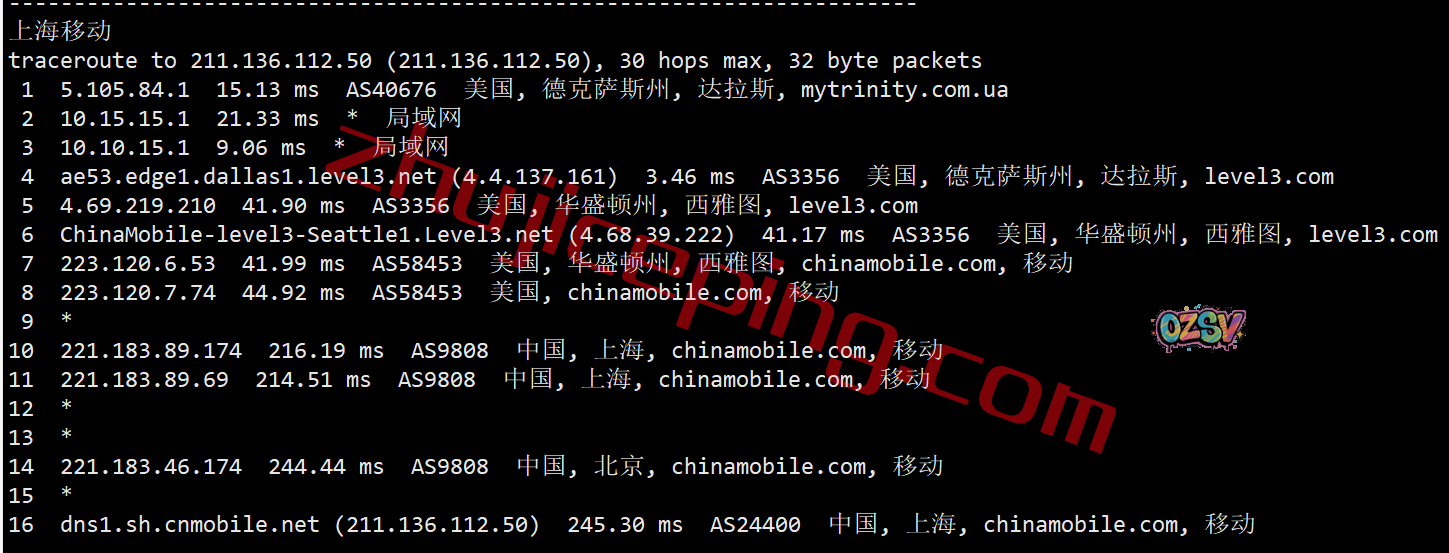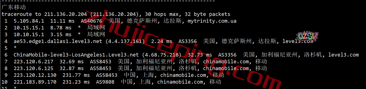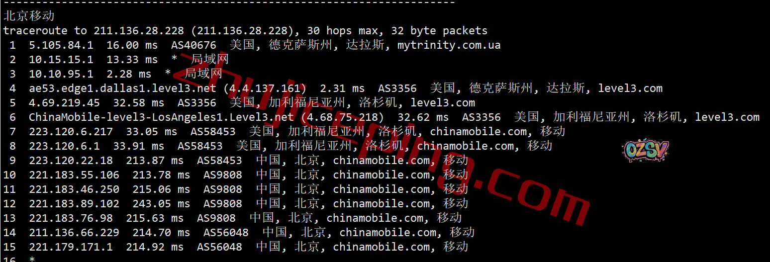 移动去程:直连移动西雅图节点后走level3去达拉斯
