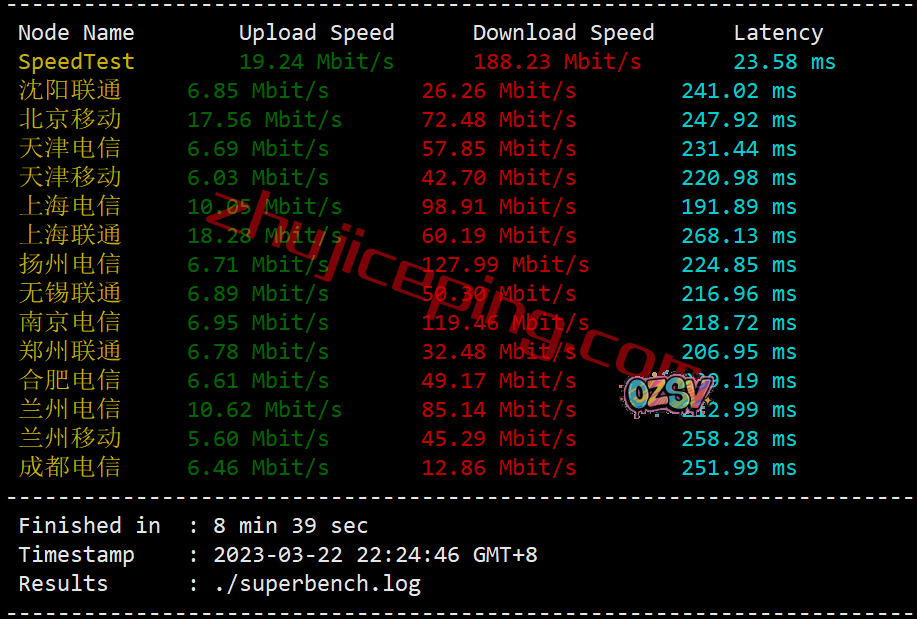 用speedtest国内三网部分节点跑一下上下行,看看带宽能到多少吧?大致数据如下: