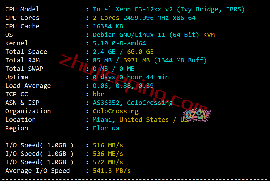虚拟化后看不到具体是哪个CPU型号,主频2.5GHz,站长启用了BBR,colocrossing的网络,当前硬盘I/O大致在541MB/S:
