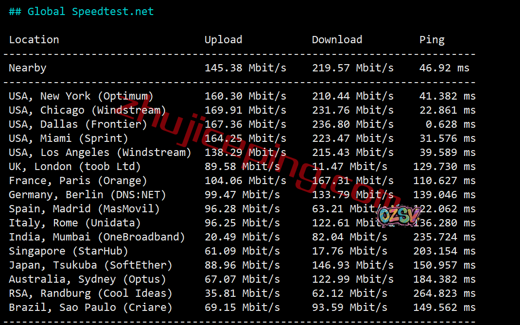 用speedtest的国内三网节点跑一下上下行带宽,看看能冲到多少吧?大致数据如下: