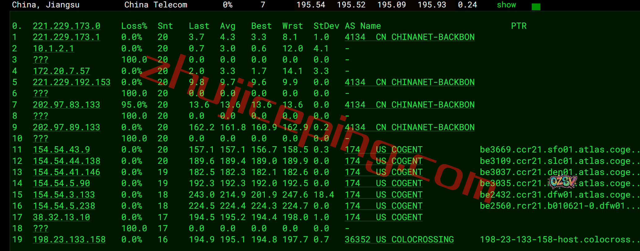 电信去程:直连电信圣何塞节点,然后走cogent去达拉斯