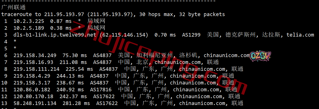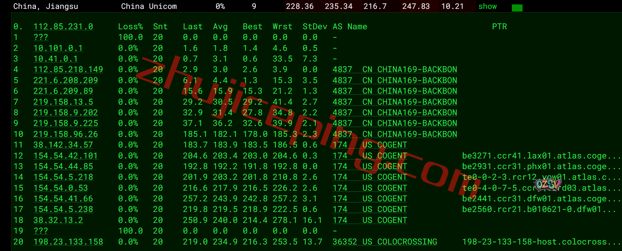 联通去程:直达联通洛杉矶节点,然后走cogent去达拉斯